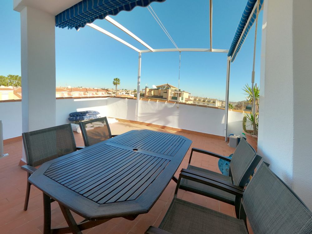A two bedroom, cozy top floor duplex with a good size balcony and private solarium. There are numerous bars and restaurants just a few minutes away and the famous Zenia Boulevard shopping centre is a short drive away. The blue flag beaches of La Zenia, Campoamor and Cabo Roig are just 10 minutes drive.