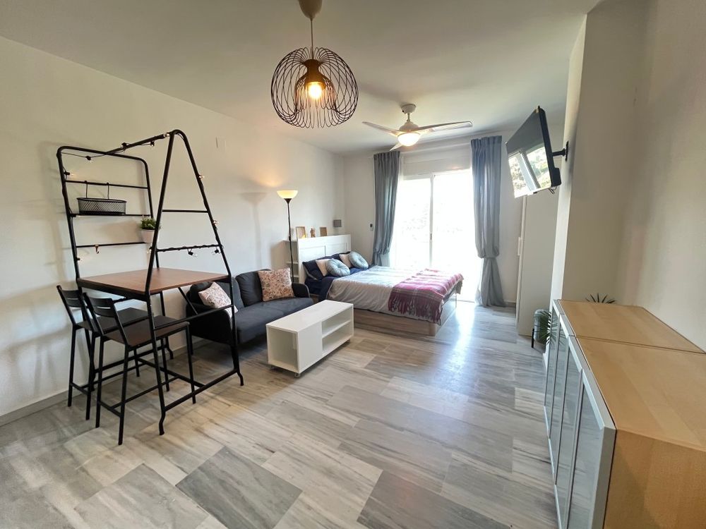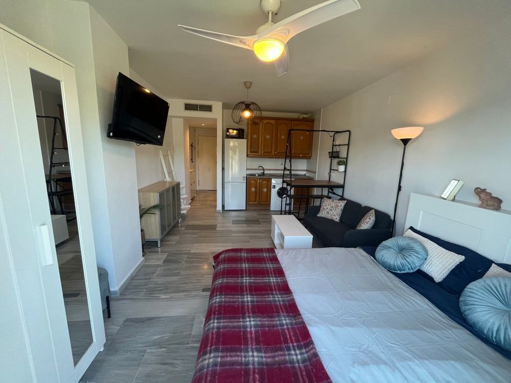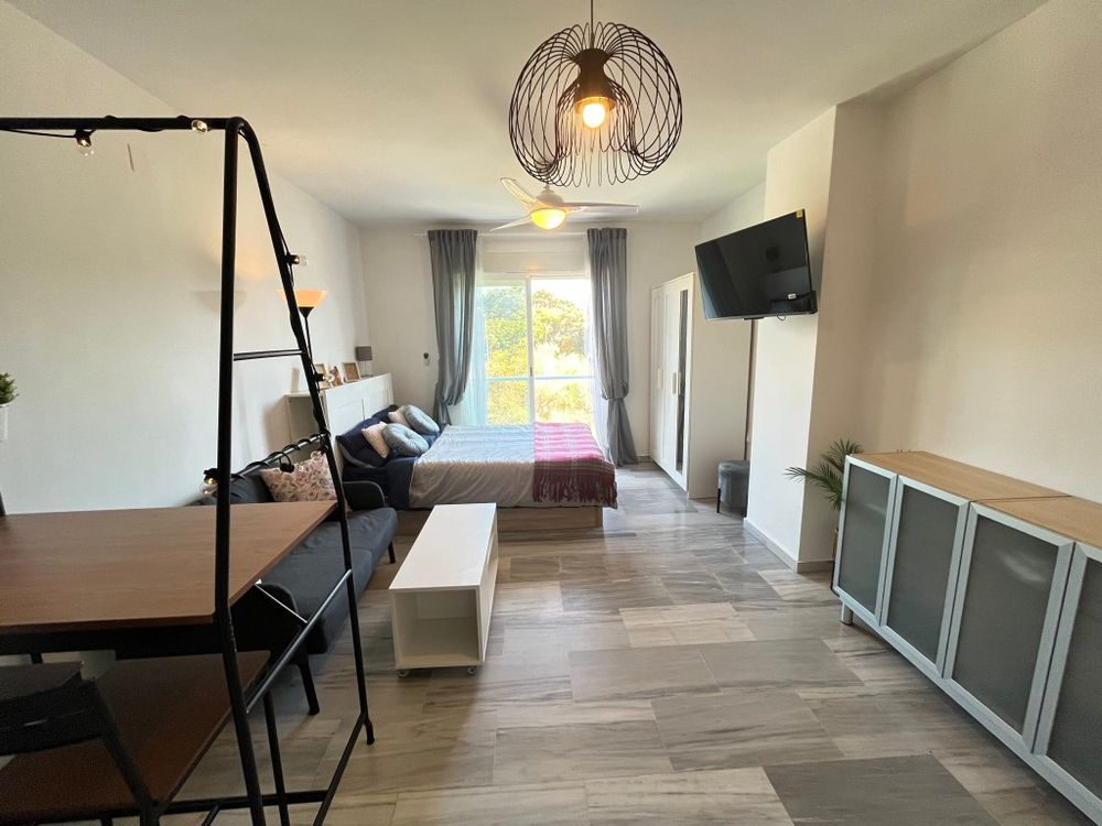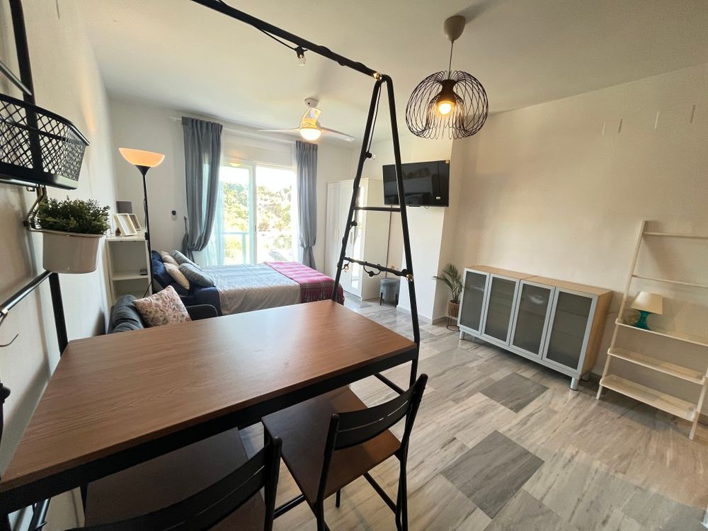 Fully furnished studio on the 2nd floor in the beach area in the Nelson building, Las Chapas Playa residential complex (El Rosario exit), 700 metres from the beach, next to Las Chapas School, within walking distance of shops, supermarket, pharmacy and bus stop, with Marbella centre just 6 km away. The studio has views over the car park, mountains and communal garden, and the complex has a communal swimming pool. Pets are not allowed. Available to rent for long term at €750 per month plus electricity and water consumption. No finder's fee.
