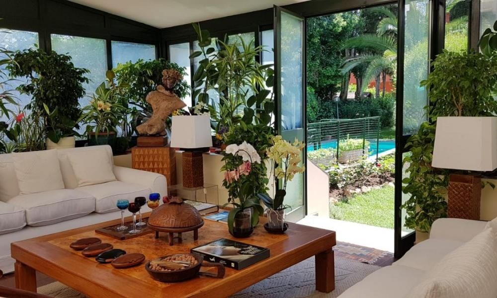 Directly off the Living and DIning room, we have a beautiful lush garden with mature trees and shrubs, a covered pergola for outdoor dining and relaxing and a lovely private pool immersed in greenery.