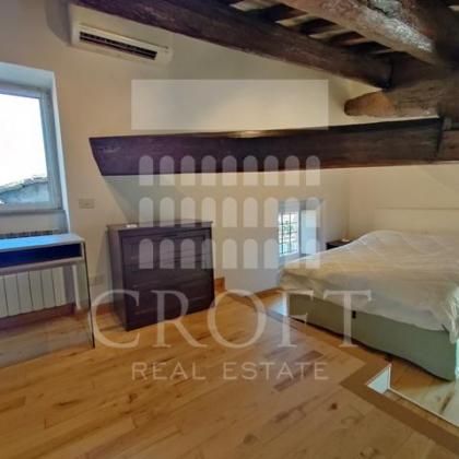 L’appartamento disposto su due livelli si compone al primo livello di un'ampia zona giorno con cucina a vista. Il soggiorno, arredato in stile moderno, è il vero cuore della casa, caratterizzato da un imponente soffitto alto 5 metri con le originali travi in legno a vista, che conferisce un'atmosfera calda e di grande carattere, i pavimenti in parquet aggiungono un tocco di eleganza naturale, mentre l'aria condizionata assicura un comfort ideale in ogni stagione. L'abbondante luce naturale inonda lo spazio grazie a tre ampie finestre, che offrono una vista indimenticabile sui suggestivi tetti di Roma e sui suoi monumenti. Il soggiorno è dotato di un pratico divano letto e la presenza di un bagno di servizio al piano lo rende perfetto per accogliere gli ospiti. Completa la zona giorno la moderna cucina a pianta aperta completamente attrezzata situata in un'alcova dello spazio abitativo. Dotata di lavatrice, lavastoviglie, piano cottura e grande frigorifero e tanto spazio per riporre gli oggetti.