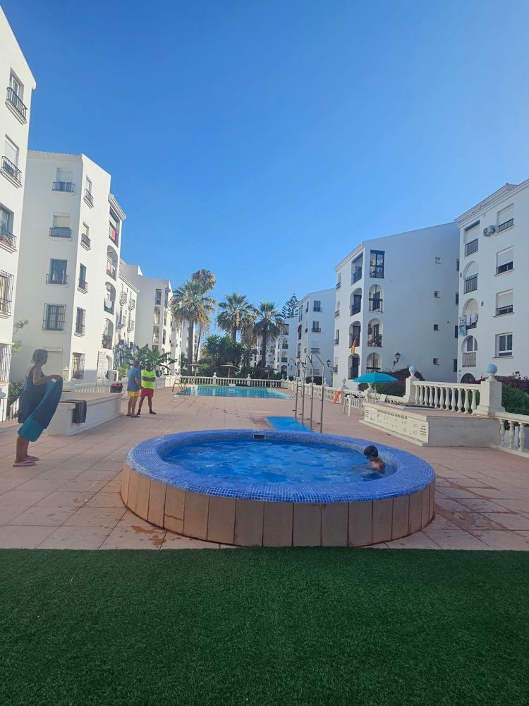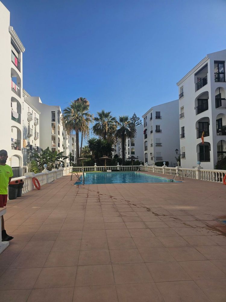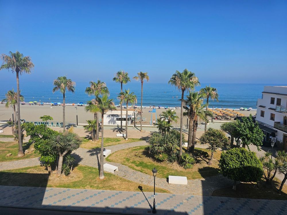 Centro de San Luis de Sabinillas, fantástico piso de un dormitorios vistas directas al mar en linea de playa, amplio con cocina independiente, vistas desde la terraza y desde el comedor-salón y de un dormitorio. Modernamente amueblado. Zona de piscina, baños comunes área piscina, hermosos jardines tropicales. El piso esta en excelente ubicación con posibilidad de baño en la playa y/o uso de la piscina de la urbanización. En frente de la urbanización un parque infantil. Vistas panorámicas directamente al mar