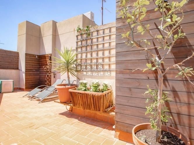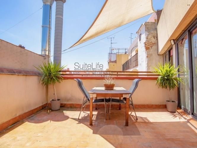 This is a beautiful duplex attic w/ duplex terrace! It has about 55m2 + 35m2 terrace (there are actually 2 terraces). The flat has 1 sunny exterior double bedroom and 1 full bathroom w/ bathtub. There is a breathtaking 2-level terrace w/ 2 tables (1 on each level), a shower, plants, & unforgettable views of Montjuic & the city. There is an American-style kitchen w/ fridge, freezer, oven, stove, dishwasher, microwave, toaster, all plates, dishes, pots, pans, utensils, etc... The flat is fully furnished, renovated, & equipped. It’s a 4th floor real WITH lift. The flat has tons of natural light! Heating, hardwood flooring, and sofa bed. Excellent location on Rambla Raval (4 minutes walking to metro l2 ’’sant antoni’’ & l3 ’’liceu’’). Parking is optional (90€/MONTH).