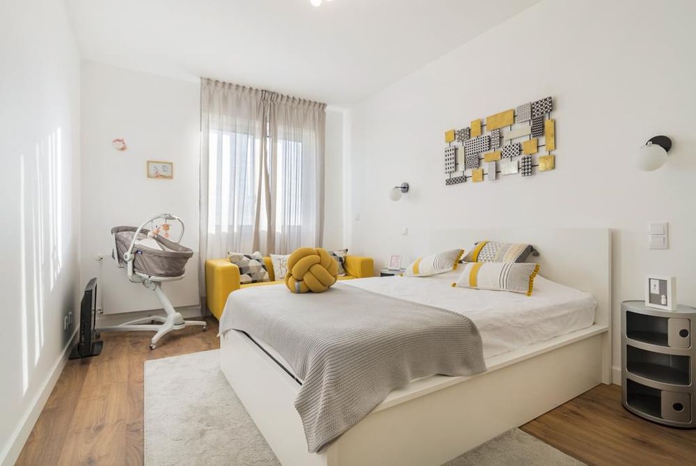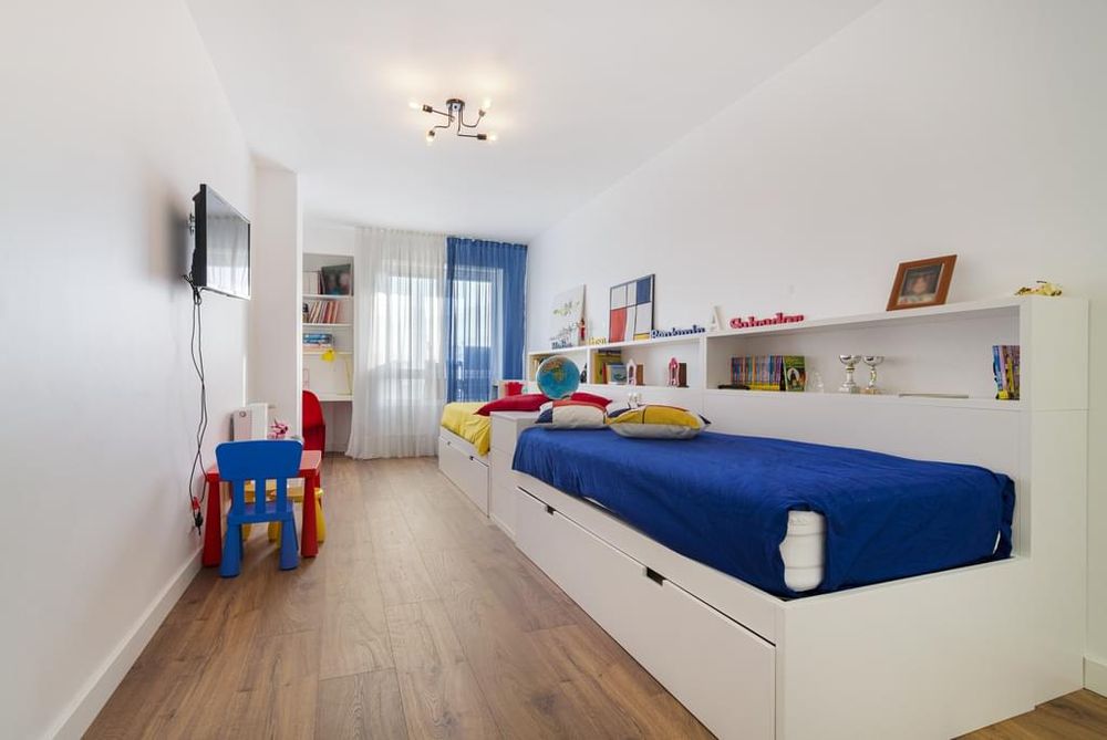 O imóvel conta com dois quartos generosos, ambos equipados com roupeiros embutidos, partilhando uma casa de banho completa. Adicionalmente, há uma suíte master com casa de banho privativa com duche. Destaca-se ainda um quarto/closet, oferecendo um espaço adicional versátil e funcional.
