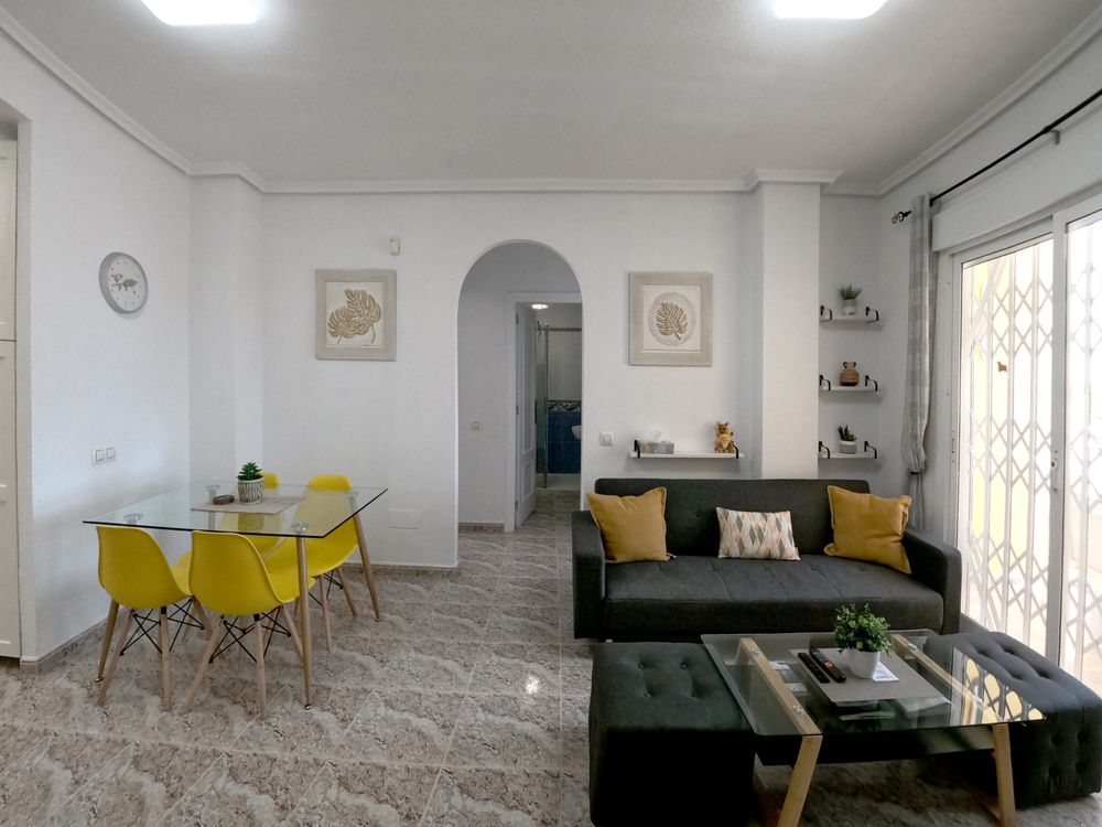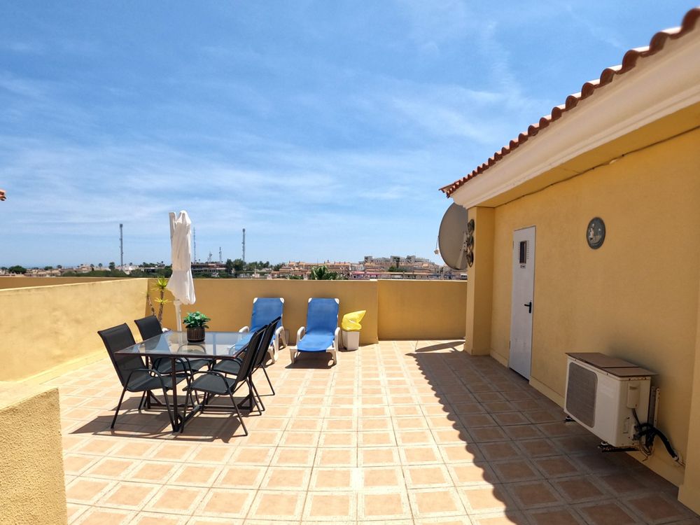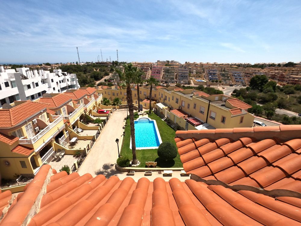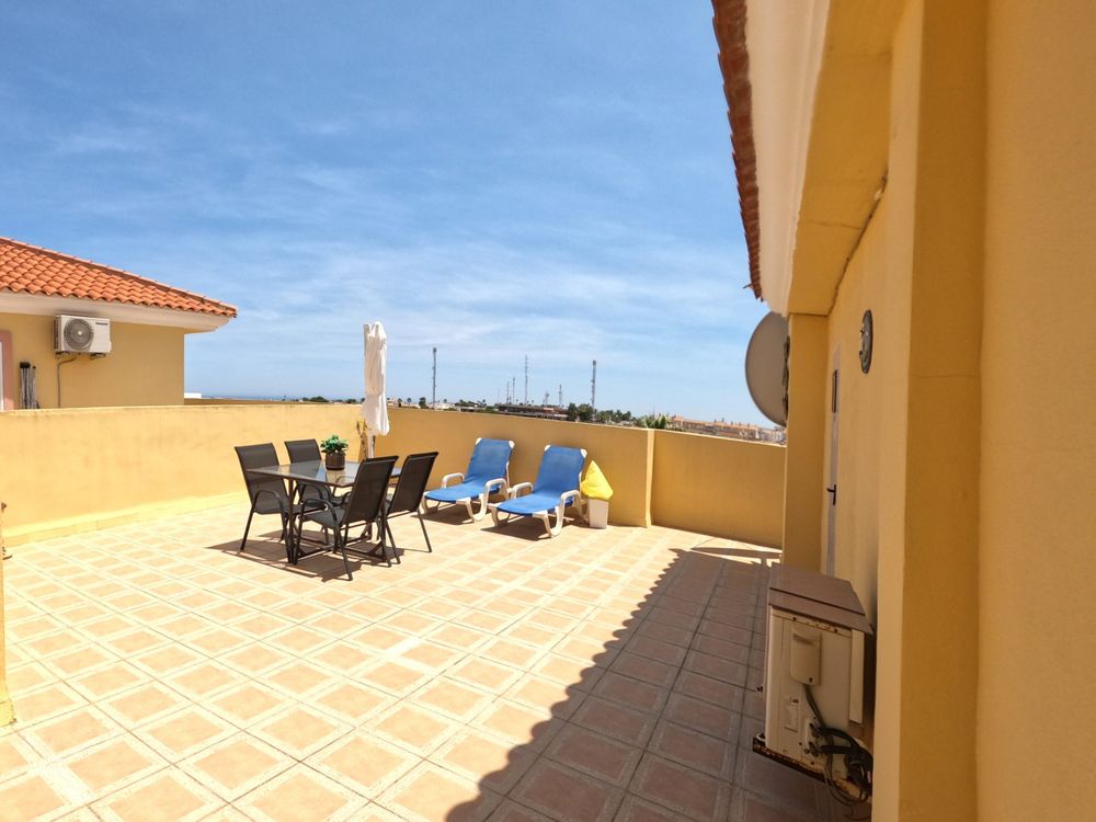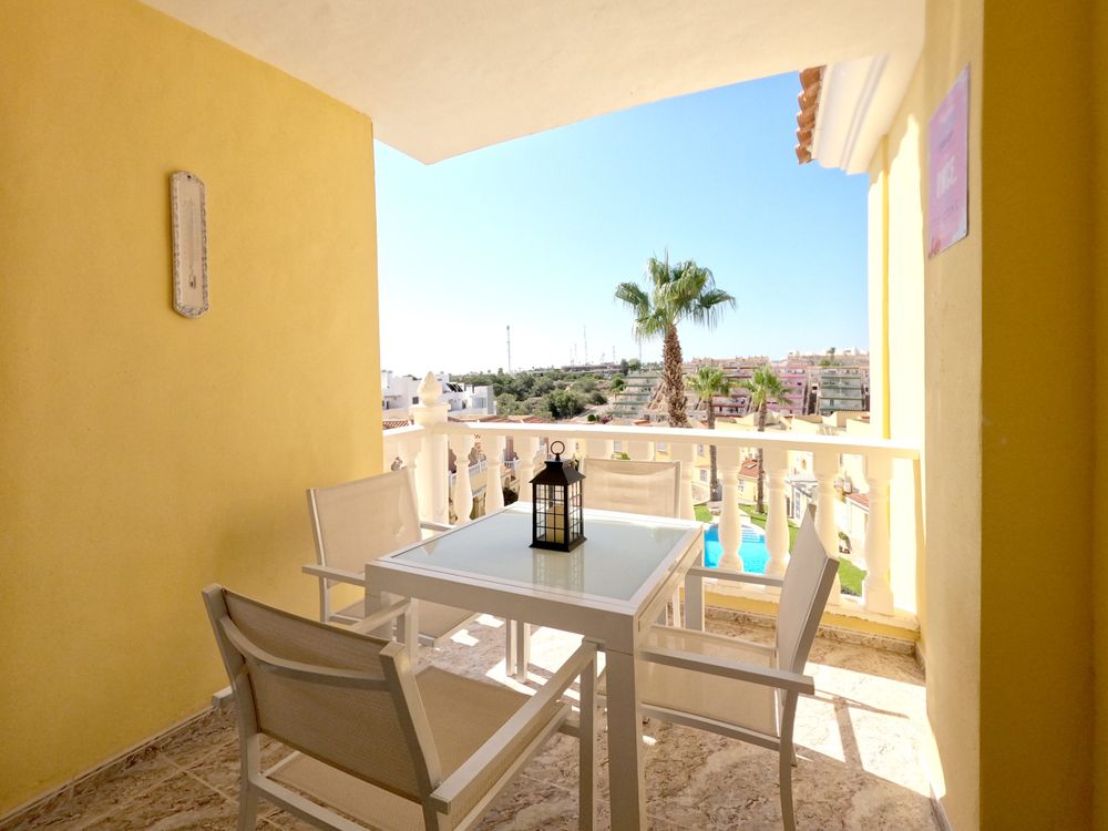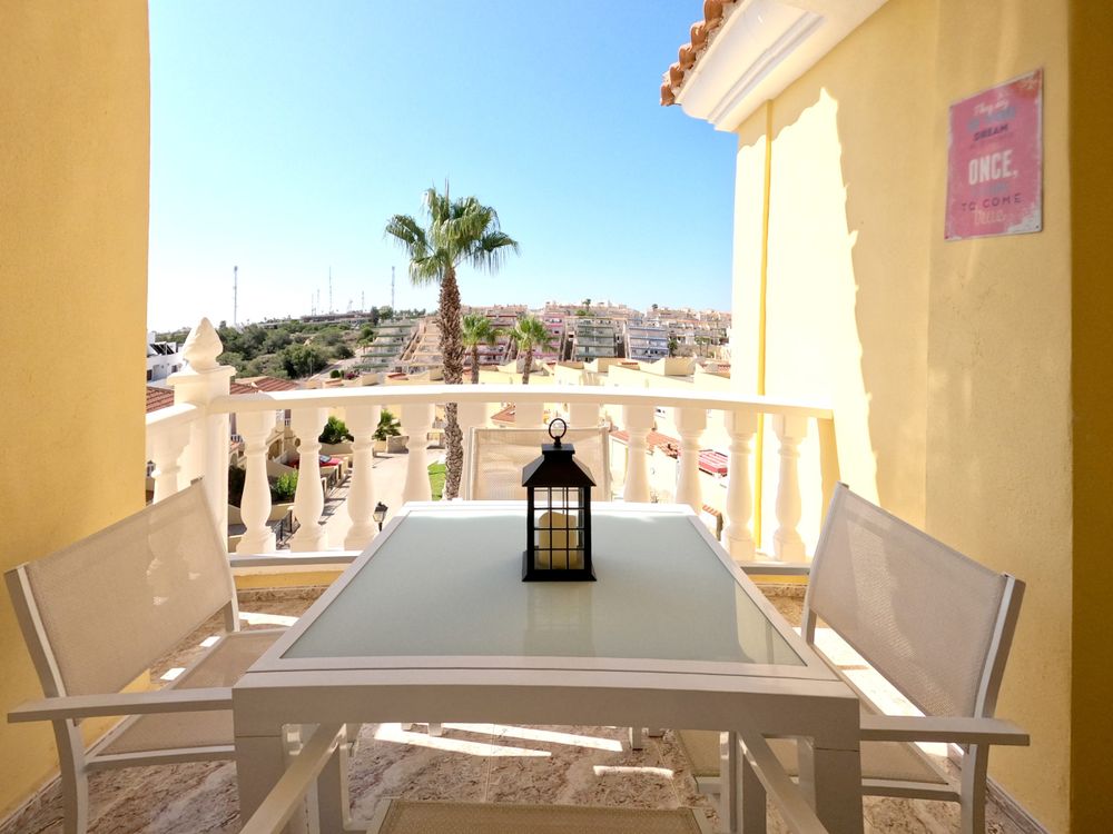 A two bedroom top floor apartment with views of the Mediterranean Sea. This apartment is modern and has been furnished to a very high standard. It has a large private solarium with sunbeds, a sun umbrella and dining table with chairs to enjoy al fresco meals. Wi-Fi is included, as well as air-conditioning in the lounge and modern ceiling fans in the bedrooms. La Zenia Boulevard is just a short distance away and the golden blue flag beaches of the Orihuela Costa are close by. There are numerous bars and restaurants within walking distance of the property, and Villamartin Golf Course and The Plaza are just a short stroll away. The complex has one large swimming pool within the grounds.