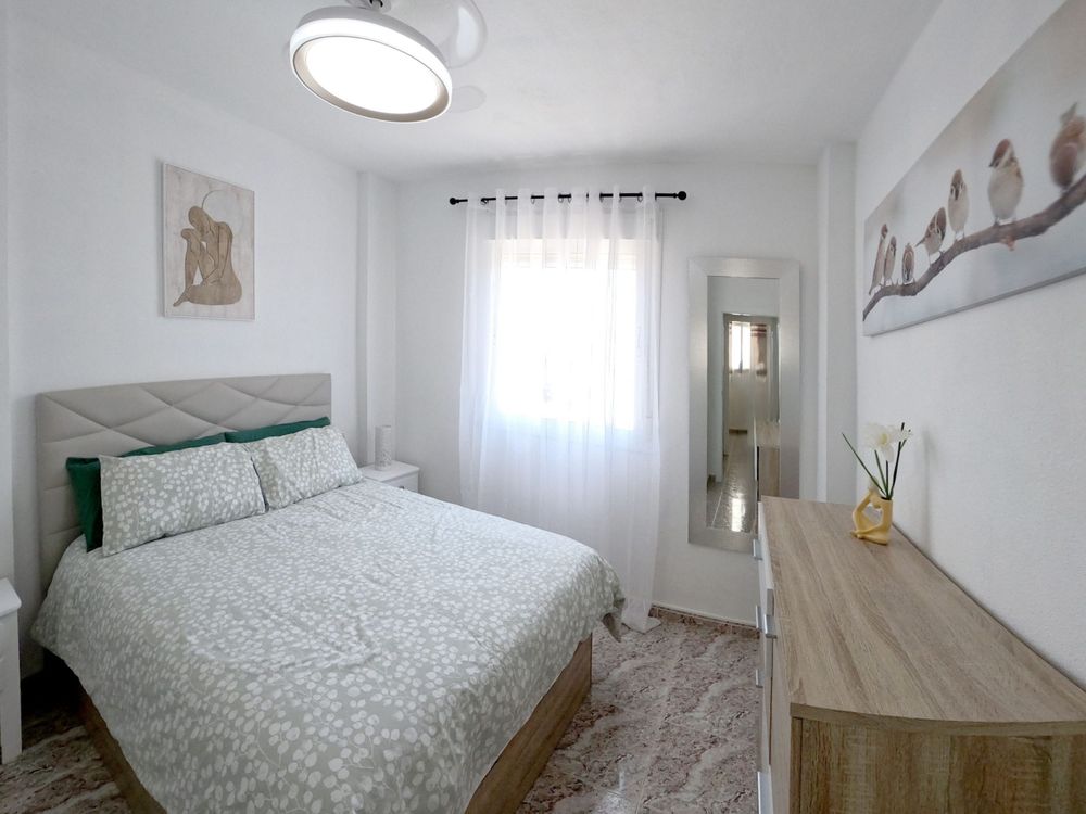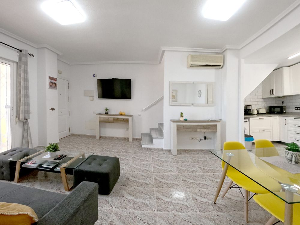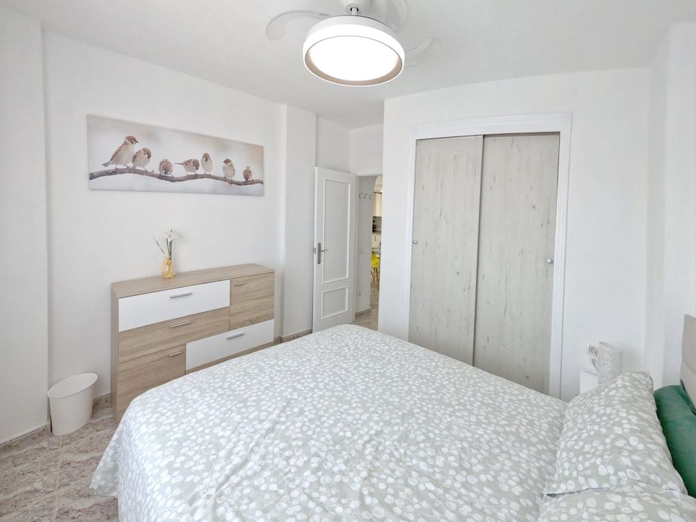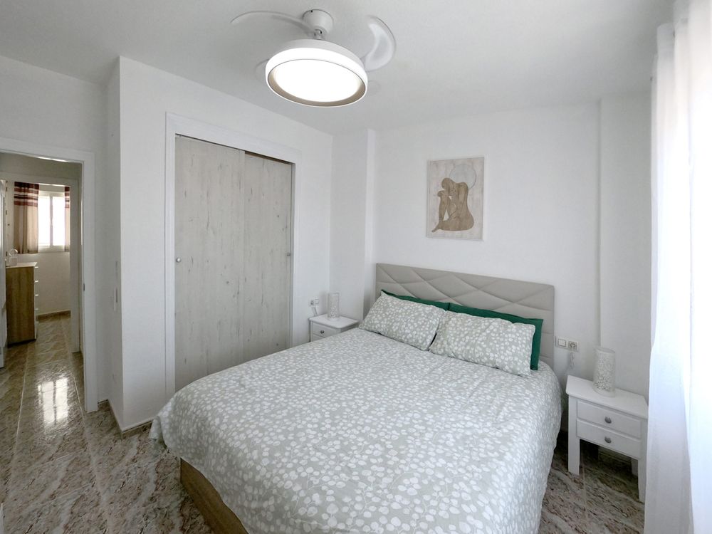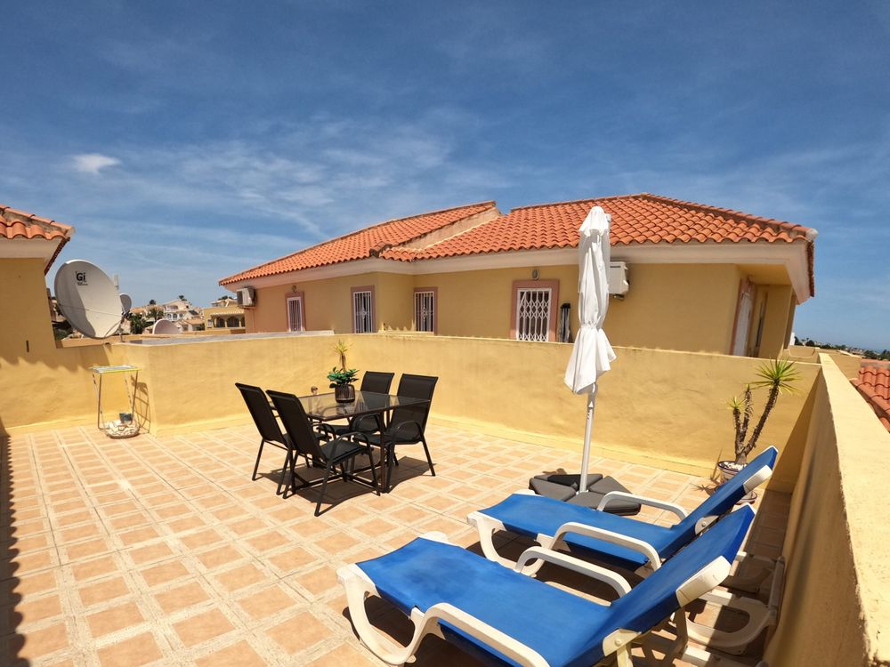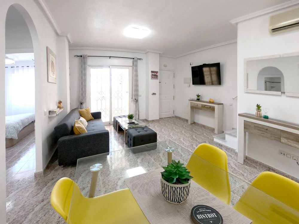 A two bedroom top floor apartment with views of the Mediterranean Sea. This apartment is modern and has been furnished to a very high standard. It has a large private solarium with sunbeds, a sun umbrella and dining table with chairs to enjoy al fresco meals. Wi-Fi is included, as well as air-conditioning in the lounge and modern ceiling fans in the bedrooms. La Zenia Boulevard is just a short distance away and the golden blue flag beaches of the Orihuela Costa are close by. There are numerous bars and restaurants within walking distance of the property, and Villamartin Golf Course and The Plaza are just a short stroll away. The complex has one large swimming pool within the grounds.