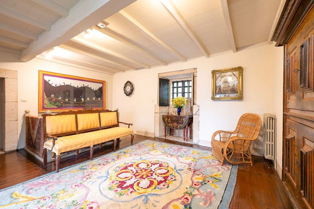 The property has four main bedrooms and two secondary ones, with a capacity for twelve people. Two magnificent lounges, with stone balconies, a fantastic stone fireplace, and ceilings with original wooden coffered ceilings, create a unique atmosphere. The kitchen, in an open space with a dining area, surprises with its typical Galician lareira, cozy and charming, equipped with everything necessary for daily life.