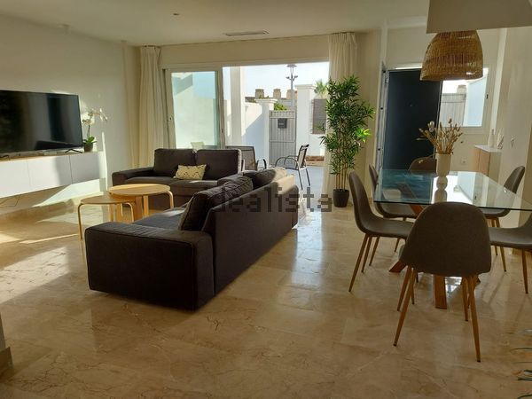 Vivienda adosada de dos plantas. Superficie de 133 M2. Consta en planta baja de un acceso a vivienda con terraza y plaza de aparcamiento exterior, vestíbulo de entrada, salón diáfano con cocina abierta al salon, aseo y un dormitorio además de un patio trasero con barbacoa. En planta alta cuenta con un dormitorio en suite con baño completo y vistas al mar y balcón, dos dormitorios uno de ellos con balcón.