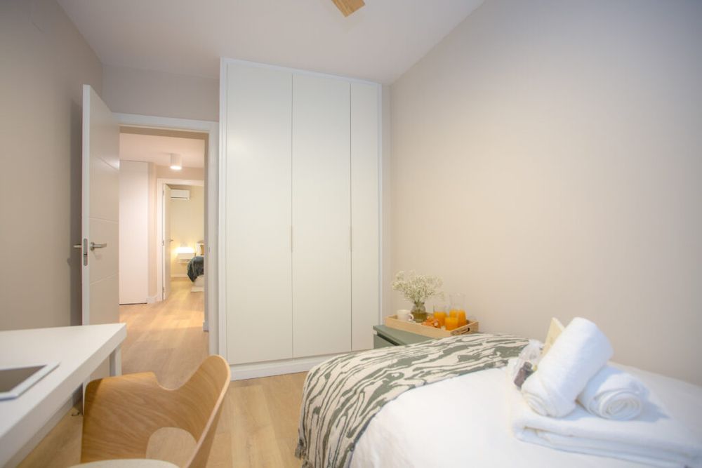 Segundo dormitorio con cama individual y espacio de trabajo.