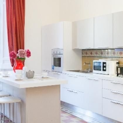 L'ingresso principale conduce a un ampio doppio soggiorno, contraddistinto da soffitti alti 4 metri e impreziositi da affreschi originali in legno. L'ambiente è arricchito da un antico camino in marmo e arredato con un mix di pezzi moderni e d'epoca. L'ampia cucina moderna, completamente attrezzata e dotata di isola, si connette a una sala da pranzo formale che può ospitare comodamente otto persone. Questa sala, con i suoi soffitti alti e pavimenti antichi, gode di tre grandi finestre che offrono una vista su una delle piazze del quartiere.
