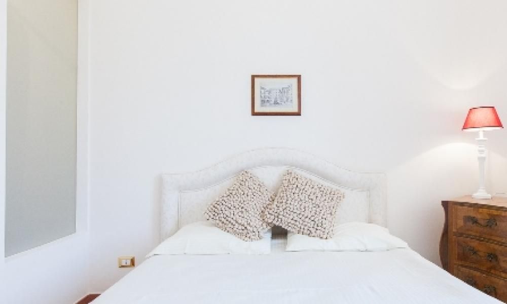 The sleeping area is well-separated and accessible via an independent entrance. It includes four bedrooms and four bathrooms. The master suite is a spacious double bedroom with a view of the square and a private bathroom, completely renovated in marble and equipped with a shower and a tub. The second suite, also with a view of the square, has high ceilings and an en-suite bathroom with a shower and a tub. The third bedroom has two single beds and a private bathroom with a shower. An internal flight of stairs leads to the fourth bedroom with two beds and direct access to a small, quiet terrace overlooking the internal courtyard. A fourth full bathroom is located in the common area on the lower floor.