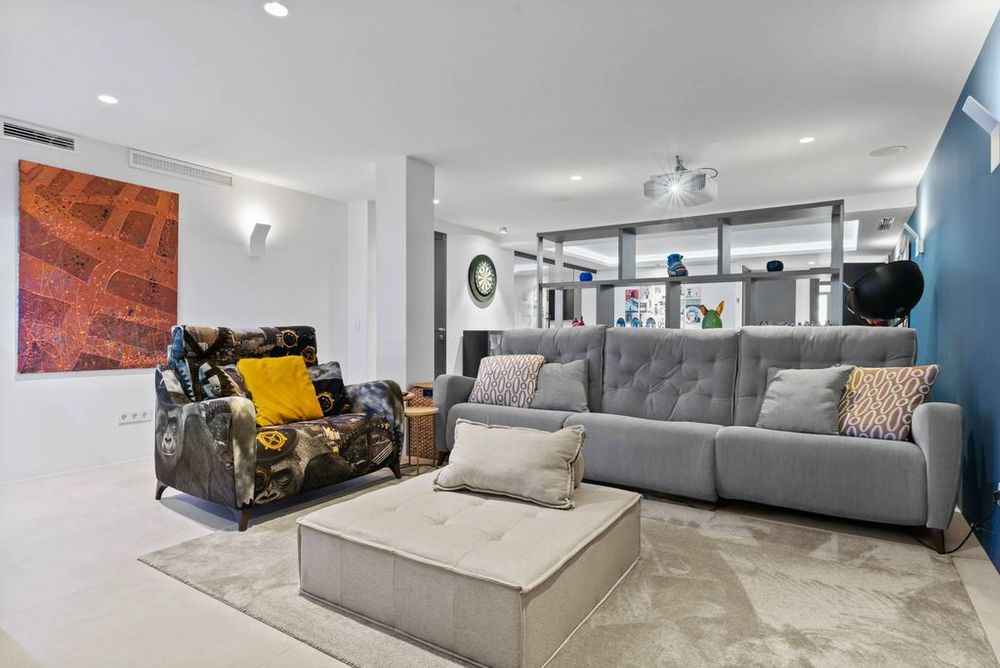 The villa is distributed over three floors and it offers a modern design that fits perfectly with the Mediterranean exteriors. On the shared areas you will find a living room, with a stunning fireplace, a dining area, and a fully fitted kitchen. The ground level has a fabulous cinema room and a gym. This level has access to the incredible exteriors, where you will find the swimming pool and bbq area. There are 6 comfortable bedrooms, 5 of them are en-suite.