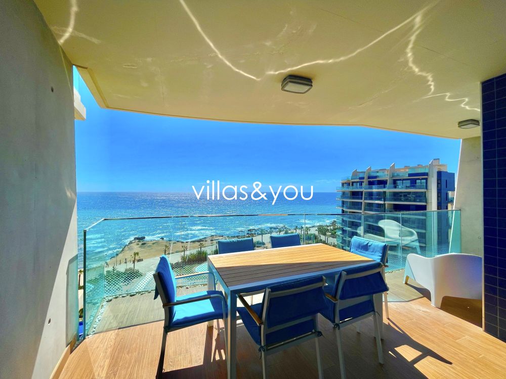 The apartment is located on the 8th floor with lift access and boasts the most amazing sea views you will ever see, it is very bright, nicely furnished and has a large terrace with exceptional sea views and has full air-conditioning (hot/cold) in the whole apartment, American kitchen with dishwasher and everything you will need for a perfect stay… It also has a private underground parking spot included.