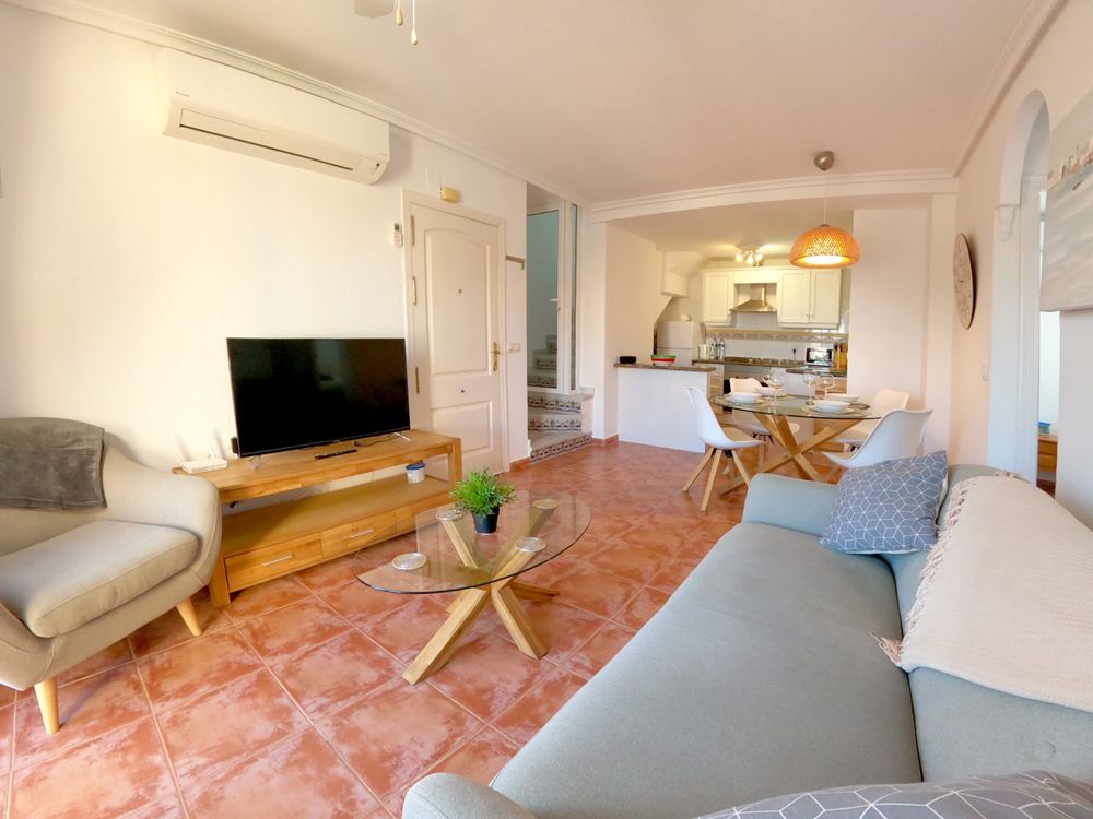 A two bedroom, cozy top floor duplex with a good size balcony and private solarium. There are numerous bars and restaurants just a few minutes away and the famous Zenia Boulevard shopping centre is a short drive away. The blue flag beaches of La Zenia, Campoamor and Cabo Roig are just 10 minutes drive.