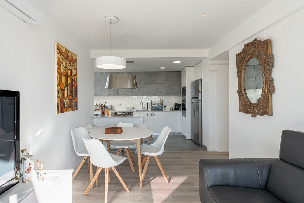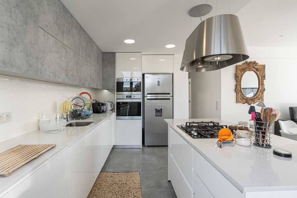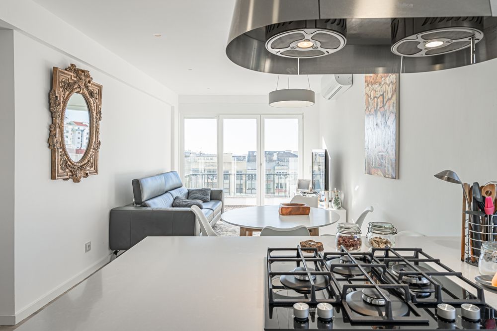 A zona social desenvolve-se em open space, onde uma cozinha totalmente equipada se integra harmoniosamente com a sala, criando um ambiente amplo, funcional e perfeito para momentos em família ou entre amigos. A sala estende-se até uma varanda agradável, proporcionando luz natural e um espaço exterior ideal para relaxar.