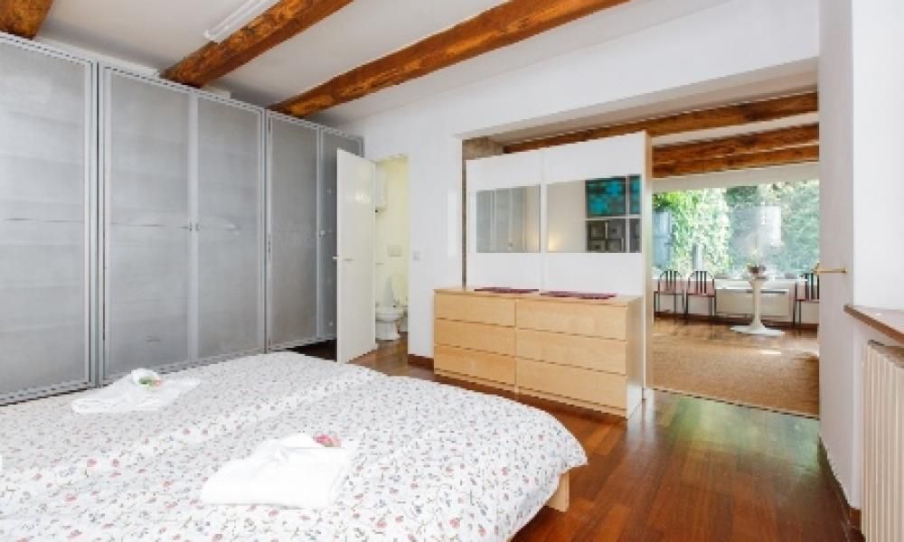 Interni: L'appartamento è caratterizzato da pavimenti in parquet scuro che donano un senso di calore e raffinatezza. Le travi in legno a vista sul soffitto e le pareti in pietra a vista in alcune stanze, conferiscono un tocco rustico e storico all'ambiente. Grandi finestre, come quella che si affaccia su un rigoglioso muro di edera, inondano gli spazi di luce naturale, creando un'atmosfera luminosa e accogliente.