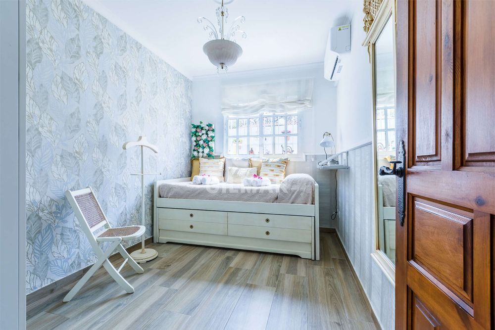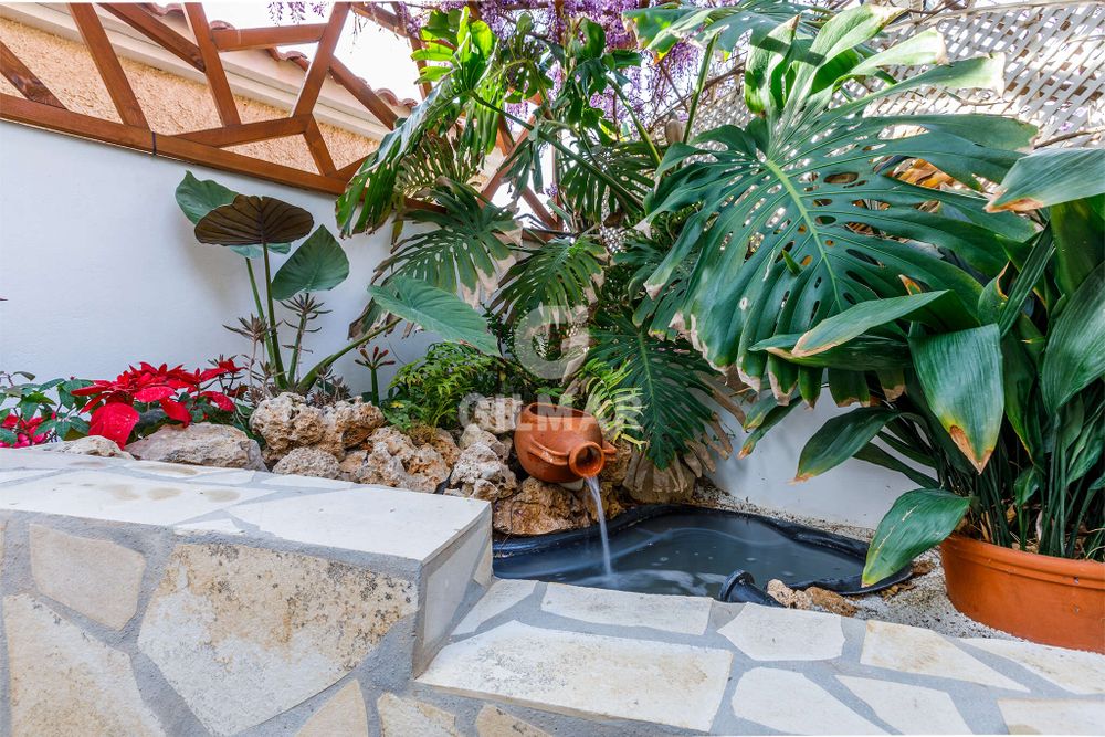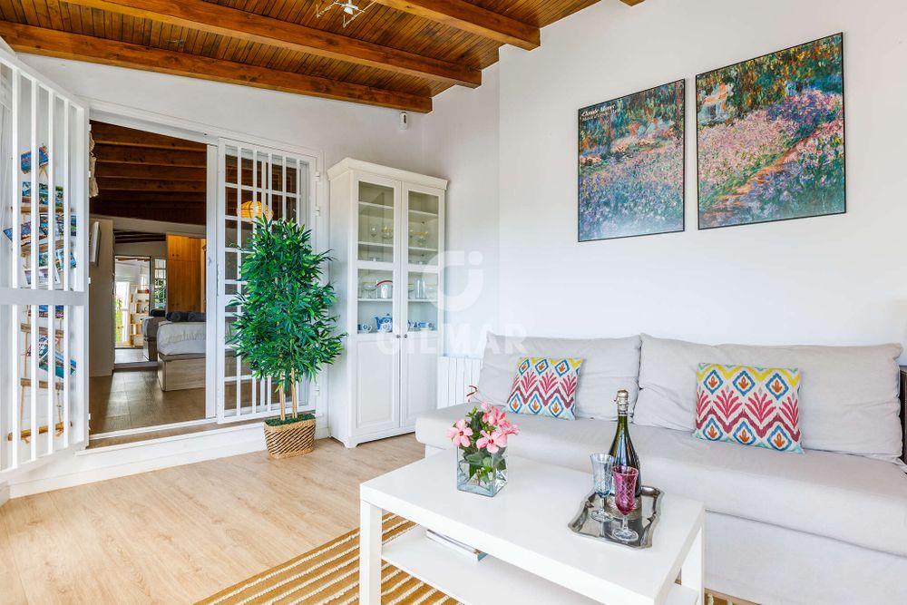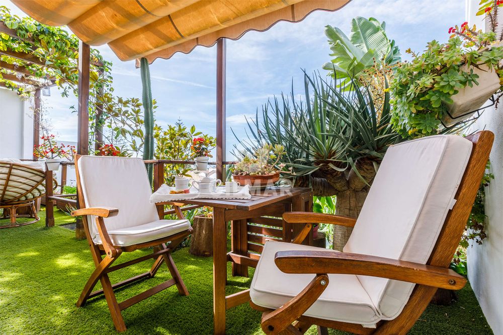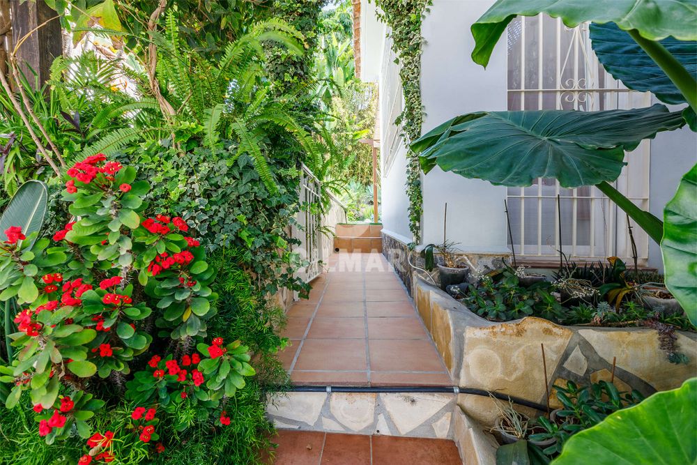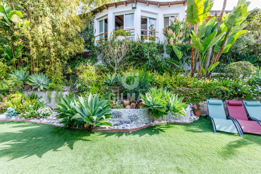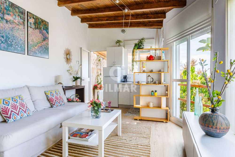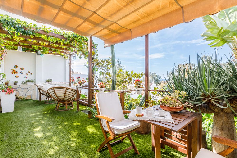 Accediendo a la planta alta del jardín, damos paso a un hermoso apartamento equipado con un dormitorio, un vestidor, un baño y una cocina abierta al salón con acceso a una bonita y acogedora terraza con vistas al mar.