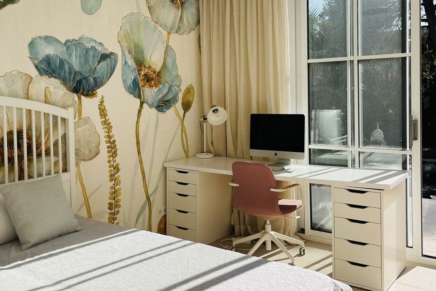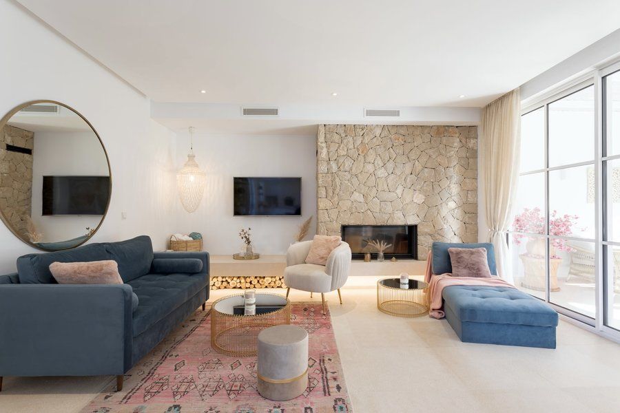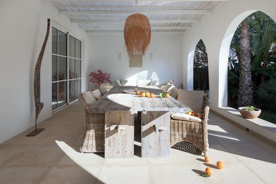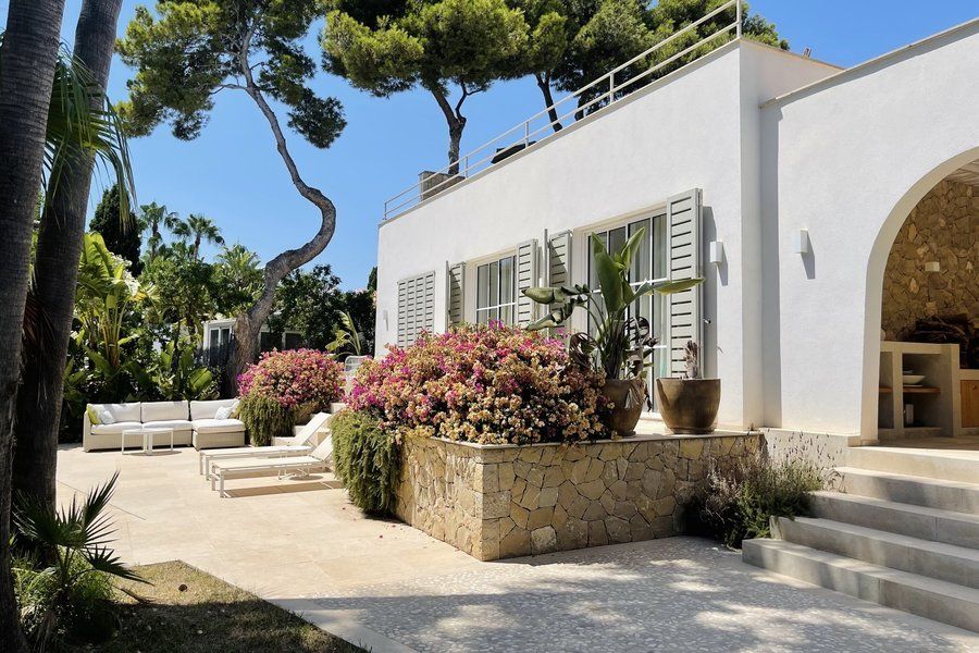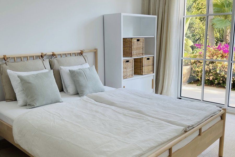 Available July and August. This wonderful, very modern and luxurious house of approx. 218 sqm is divided into an open kitchen with a spacious dining and living area. The hallway leads to 3 bedrooms, a master bedroom with en-suite bathroom and another separate guest room with guest toilet. The beautiful natural stone floors, glamorous furniture and decor create a lasting holiday feeling of relaxation and good energy. From all bedrooms and parts of the living area you have access to the garden, which is planted with beautiful wild bananas and palm trees and leads to the 30 sqm saltwater pool, where you can take a refreshing dip in the warmer summer months. There is also a covered terrace with a seating area and a large and beautiful wooden dining table where you can dine al fresco all year round. \nThe house has a separate guest studio with bathroom, which can be reached via a separate external staircase. There is a large and sunny terrace of over 40 sqm where you can enjoy the beautiful sun or even practice yoga at sunset. The house is fully equipped for a comfortable stay with central air conditioning (hot/cold), a cosy fireplace, alarm system and there are two parking spaces with both covered and uncovered parking. Nearby amenities, restaurants and beautiful beaches are within walking distance.
