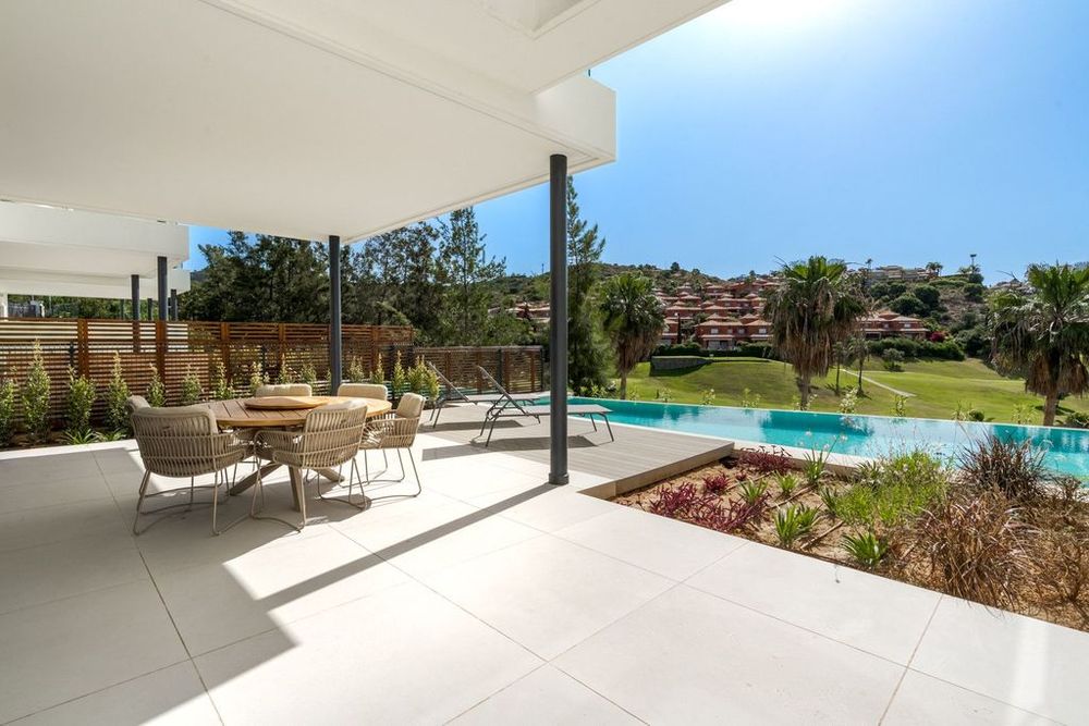 Other notable features of this villa include a guest toilet, private terrace with mountain and golf views, underfloor heating throughout, a laundry room, and Wi-Fi internet access. The covered terrace allows for outdoor dining and relaxation, while the fitted wardrobes provide ample storage space.