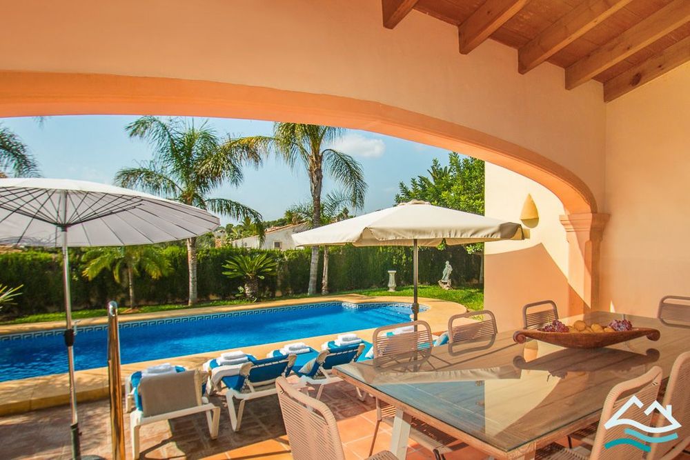 The villa features a large terrace with a table and chairs. Under the shade of the porch, it is a lovely place to enjoy the Mediterranean climate and the long summer sunsets. You will also find two more spaces to share moments with friends and family. The pool area. In the villa's uncovered parking, two vehicles can be parked. Villa located in Moraira, just a few minutes by car from all services, but in a very quiet and private area.