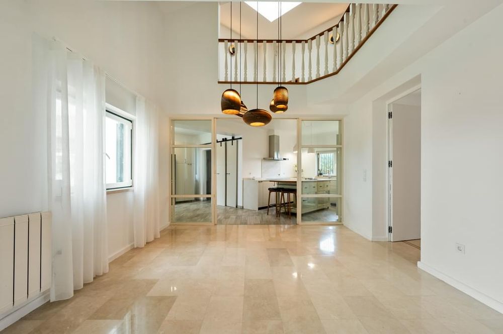 - Living room with 50 m² with fireplace and access to the terrace and garden
