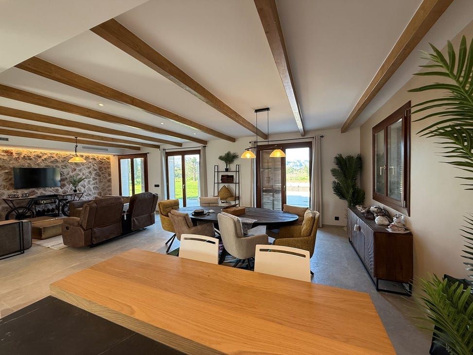 Set on an extensive 62, 000 m plot in the sought-after area of Puerto Pollena, this impressive 393 m property combines the charm of Mallorcan architecture with modern comfort. Its natural stone faade, the well-kept interior finishings and the recent comprehensive renovation, which includes underfloor heating, make it a unique gem in the north of Mallorca.Distributed over one floor, the main villa has 3 spacious bedrooms and 4 bathrooms, a modern open concept kitchen that integrates perfectly with the bright living-dining room. Large windows let in natural light and offer unobstructed views of the natural surroundings.The outdoor area is equally impressive: a large private swimming pool surrounded by native vegetation, outdoor living and dining areas, and a covered terrace on the top floor offering spectacular sea and mountain views. Ideal for enjoying long Mediterranean evenings in an environment of total privacy and tranquillity.In addition, the property includes an independent pool house, equipped with an air-conditioned bedroom, complete bathroom and a fully functional summer kitchen. The covered garage for two vehicles, the solar energy system for hot water, the air conditioning throughout the house and windows with security glass complete this exclusive offer.Just five minutes from the centre of Puerto Pollena and its beaches, this villa represents an exceptional opportunity to live in an idyllic setting, with close access to all essential services, outdoor activities and the natural beauty of the Serra de Tramuntana.Please do not hesitate to contact our FIRST MALLORCA team for more information and an appointment to view the property.