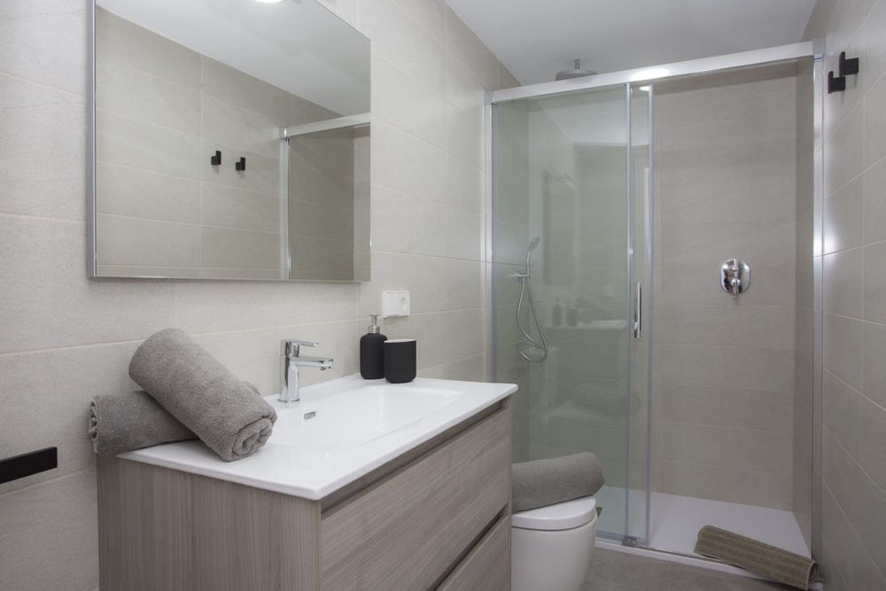 Dos baños completos con duchas a ras de suelo, mamparas de cristal y acabados modernos de alta gama.