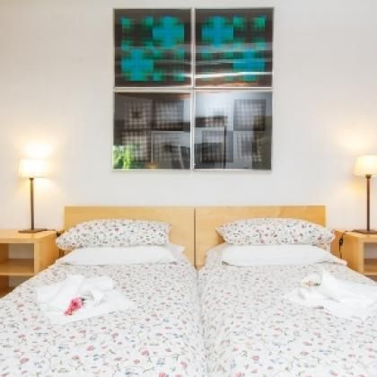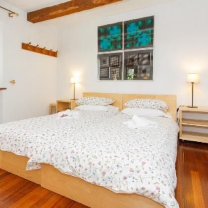 The furnishings are a mix of modern and traditional elements. We find comfortable striped sofa beds and a minimalist-style double bed. The kitchen, although small, is well-equipped with stainless steel appliances, including a hob, oven, refrigerator, and kettle, and offers everything needed to prepare meals. The bathroom is modern and functional, with a curved shower and marble cladding.