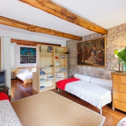 Interni: L'appartamento è caratterizzato da pavimenti in parquet scuro che donano un senso di calore e raffinatezza. Le travi in legno a vista sul soffitto e le pareti in pietra a vista in alcune stanze, conferiscono un tocco rustico e storico all'ambiente. Grandi finestre, come quella che si affaccia su un rigoglioso muro di edera, inondano gli spazi di luce naturale, creando un'atmosfera luminosa e accogliente.