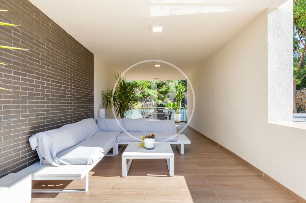 Aproperties presents this beautiful semi-detached villa of 237 m² on a 500 m² plot, located on the front line of the golf course in the exclusive El Bosque residential area. The property stands out for its brightness, thanks to large windows that open out to the garden and offer mountain views. It blends a modern yet warm style. On the main floor, there is a modern semi-open kitchen with large windows and direct access to the terrace and garden, as well as space for a breakfast table. Next is the living-dining room, which opens onto a magnificent terrace with views of the golf course. On the first floor, the property features two double bedrooms. One includes an en-suite bathroom, a walk-in wardrobe, and access to a large terrace. There is also another bedroom with built-in wardrobes and a full bathroom. Both bedrooms and the main living area are equipped with ducted air conditioning. The lower floor offers a spacious living room with large windows and direct access to the terrace and garden, two double bedrooms, a full bathroom, and a practical laundry room. All rooms, including the living area, benefit from natural light through large windows. One of the bedrooms, currently used as an office and gym, opens to the terrace and garden. The other has access to a charming English patio, providing excellent natural light. The home enjoys a magnificent southeast orientation, ensuring sunlight throughout the day. It also features ducted hot/cold air conditioning, laminate parquet flooring on the upper floor, and built-in wardrobes in the bedrooms. Outside, there is a parking area that can be covered or open, depending on preference, as well as a lovely garden with natural grass and a small vegetable patch. The communal areas include a year-round swimming pool, paddle tennis court, and children’s playground. The exclusive El Bosque residential area is just 20 km from Valencia and is located next to one of Spain's most renowned golf courses. It offers private security, a tennis club, equestrian center, social club, Olympic swimming pool, and several dining options. The area is classified as being of landscape interest. It's a privileged and peaceful setting, ideal for year-round living due to its proximity to the city of Valencia. Just a few kilometers from the estate, you’ll find a supermarket, pharmacy, and a prestigious international school. A perfect choice for those seeking an exclusive home in a natural, secure environment close to the city. If you would like more information or wish to schedule a visit, please don’t hesitate to contact us — we’d be delighted to assist you.