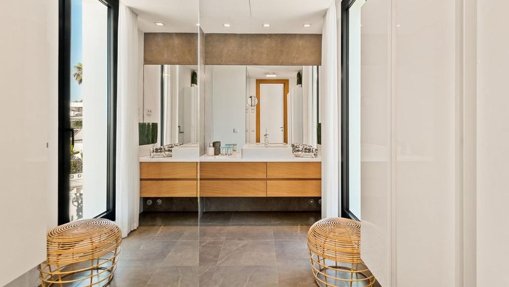 The villa has three floors and also a solarium, where you can find a fabulous terrace with a jacuzzi and stunning 360-degree views of the Mediterranean Sea.