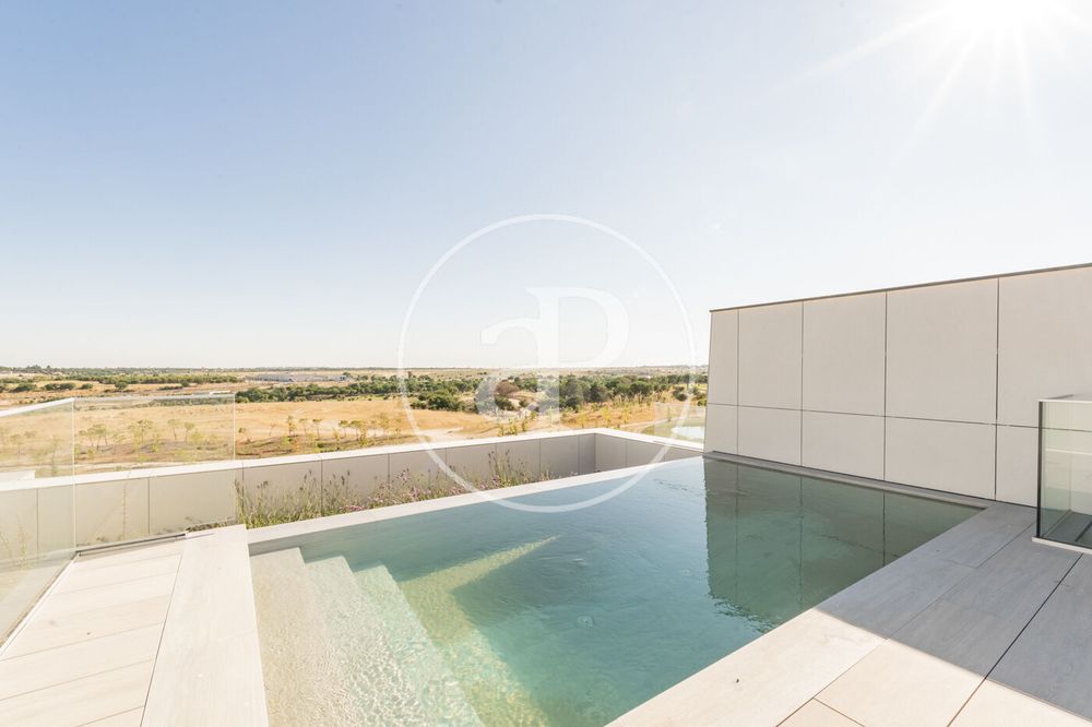 HOME AUTOMATION, OWN SWIMMING POOL, GEOTHERMAL ENERGY AND 4 PARKING SPACES. Discover this luxurious 350 m² triplex in La Finca LGC7, designed for maximum comfort and elegance. Floor 0 - Day area: Spacious 40 m² living/dining room with access to private terrace and views over the golf course. Designer kitchen equipped with state-of-the-art appliances and access to another terrace. It also has a maid's room with full bathroom and laundry area. Floor 1 - Night area: Master bedroom en suite with dressing room and private bathroom. Two additional bedrooms, also with en-suite bathrooms. Top floor - Exclusive space: Chill out with infinity pool and solarium, ideal for relaxing and enjoying panoramic views. Extras: ✔ 3 bedrooms en suite + 1 service bedroom. ✔ 4 parking spaces and storeroom ✔ Geothermal heating and air conditioning. ✔ Advanced home automation ✔ 24 h security in one of the most exclusive areas of Madrid Located in Pozuelo de Alarcón, it offers access to the best schools, hospitals and services, just 12 km from Madrid. Can you imagine living here?