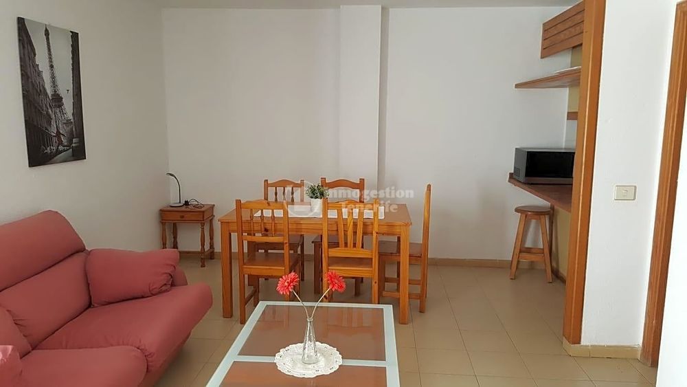This approximately 68 m² apartment features 2 bedrooms, 1 bathroom, a fully equipped open-plan kitchen, and a living/dining room with access to a spacious balcony (approx. 12 m²) overlooking the pool. The complex offers a restaurant, bar, and more.