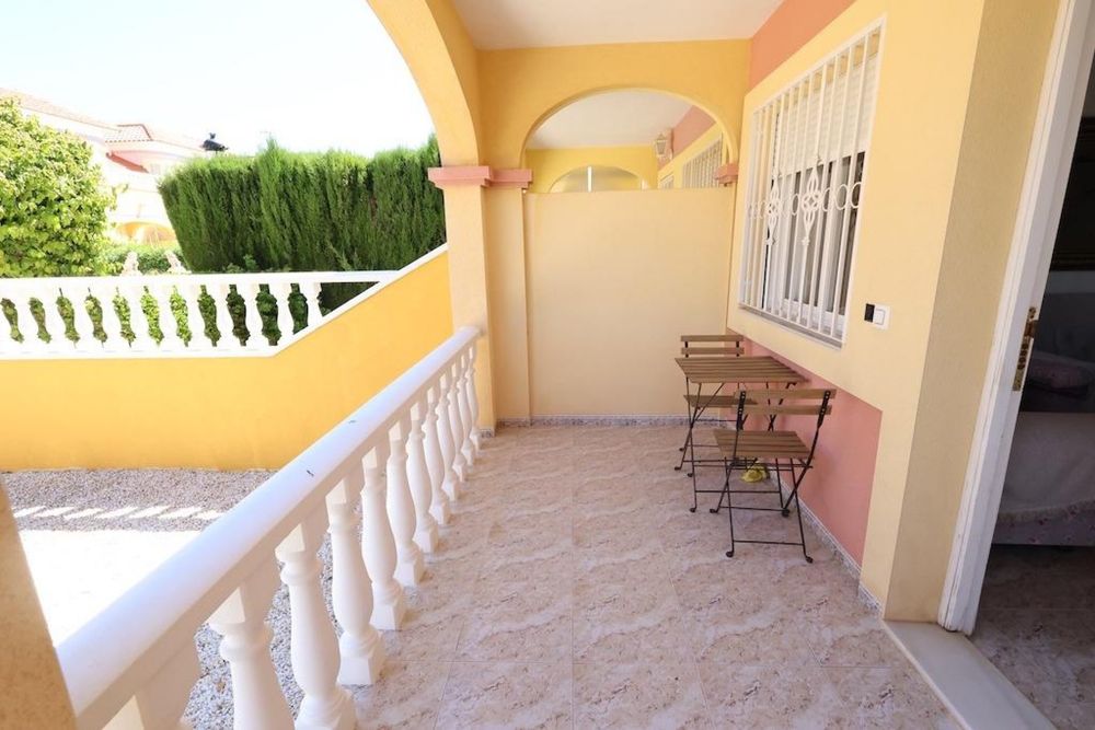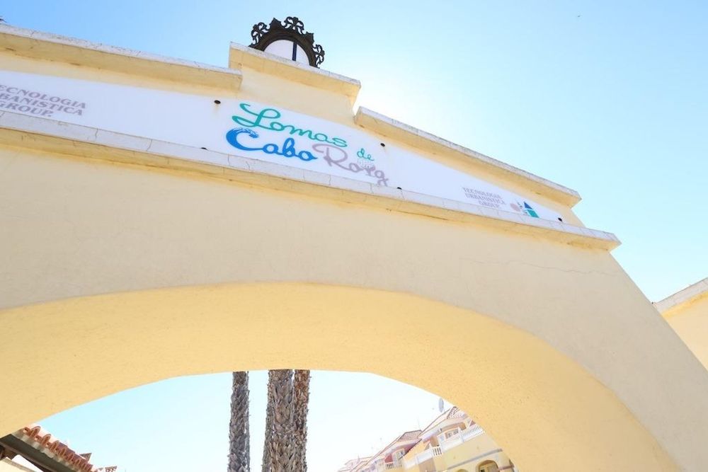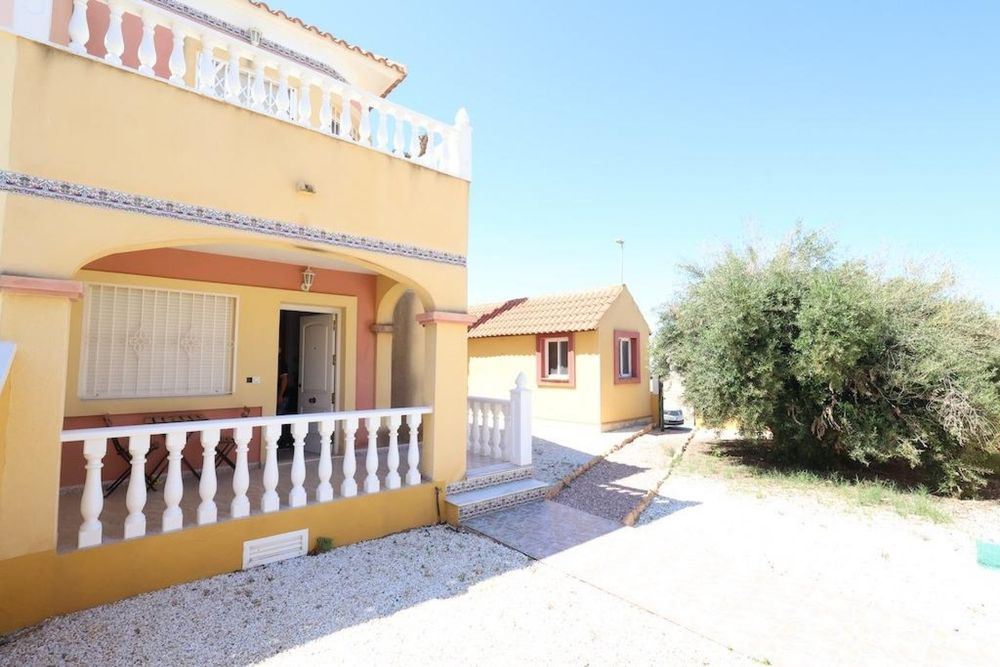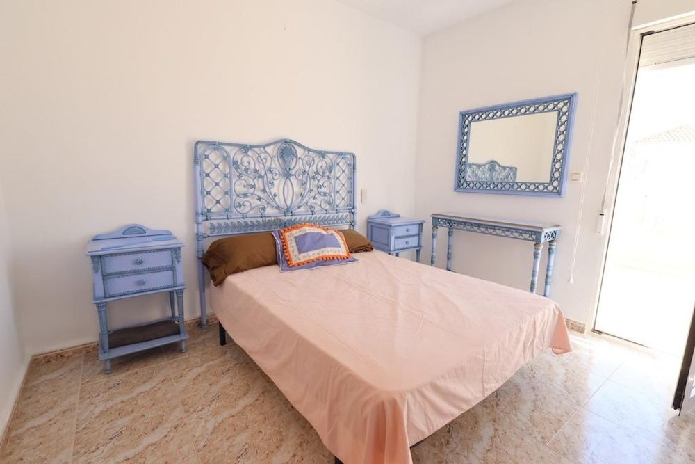 Adosado en La Regia . Vivienda de esquina con su propia entrada desde la calle y parcela de 120 m2 , La parcela tiene entrada para el coche, zona para la barbacoa con amplia pergola de esquina y un enorme trastero de unos 25 m2.~ La viviena tiene 3 dormitorios , 1 baño completo y un aseo , 3 terrazas . En la planta baja hay amplio salon , cocina independiente con la salida al patio tracero , 1 dormitorio y un aseo. En la planta de arriba hay 2 dormitorios con los armarios impotrados, cada uno con su terraza , tambien un baño completo . La vivienda esta amueblada , con aire acondicionado en el salon , ventiladores de techo en los dormitorios de arriba. Residencial dispone de varias piscinas comunitarias . La vivienda se encuentra en frente de la zona ajardinada , al lado de todos los servicios de Aguamarina , en la distancia de 1 km de la playa Poniente de Cabo Roig.~Disponibilidad impediata . Se requiere presentar solvencia .~