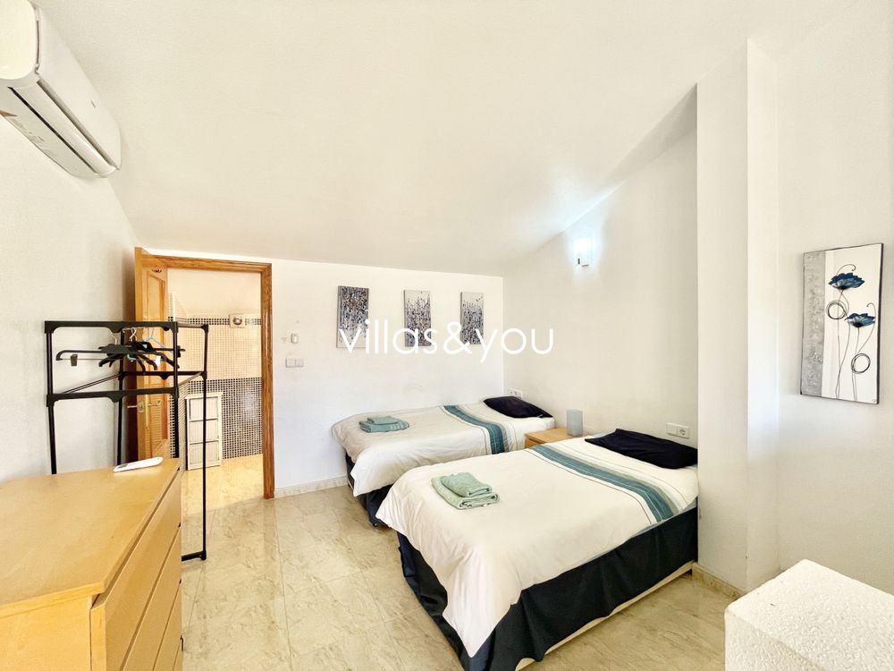 It is located in a complex with a very large swimming pool, it has 3 bedrooms, 2.5 bathrooms, living room dining room, fully equipped kitchen, front and back garden with table and chairs, several terraces with sun loungers with views of the swimming pool and everything necessary for a perfect stay.