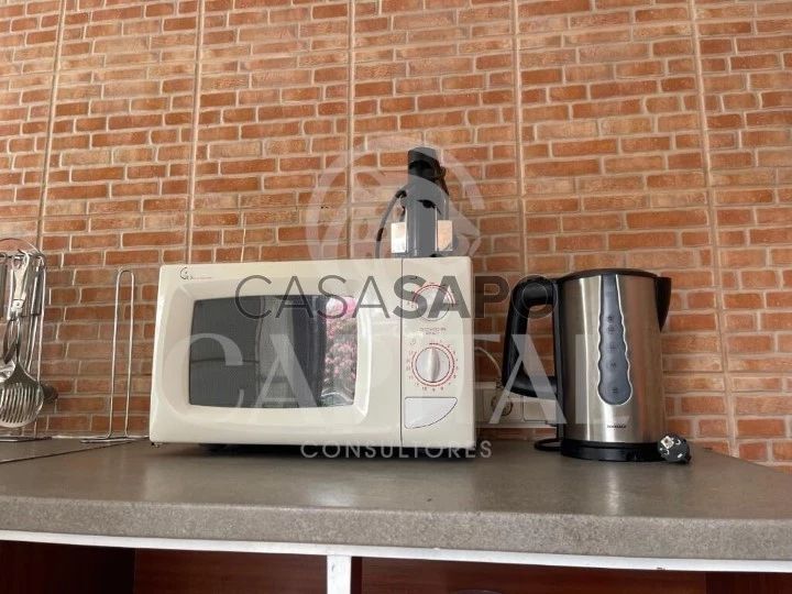 A cozinha está equipada com frigorifico, arca congeladora, fogão, micro-ondas, forno, máquina de lavar roupa.