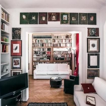 Living Room: Spacious and bright, the living room is the heart of the home. It is tastefully furnished, with comfortable white sofas and armchairs and built-in bookshelves that enhance the space. The two large windows offer an open view of the surrounding rooftops, flooding the space with natural light and ensuring maximum tranquility.