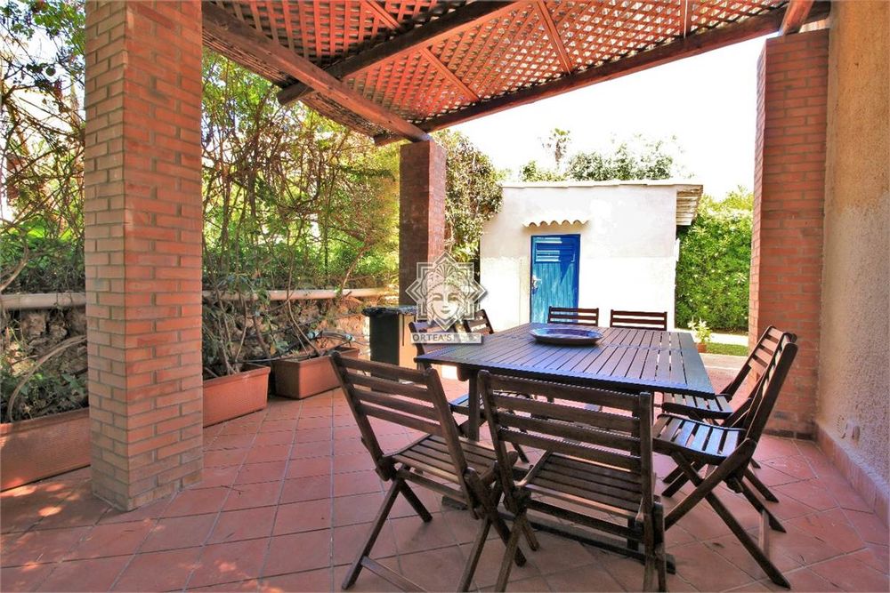Il giardino è ben curato con piante ornamentali con un patio terrazzato con arredi da esterno ad uso solarium. La villa dispone di due posti auto al coperto all'interno del residence.