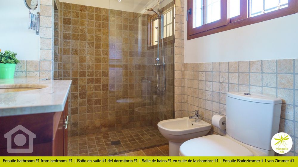 Its six bedrooms have air conditioning and beautiful sea views. On the upper floor is the main bedroom with an en-suite shower bathroom and a glazed terrace. On the same floor, there are two other double bedrooms sharing a bathtub bathroom, one with a double bed and another with two 90 cm beds. On the ground floor, there is another bedroom with a double bed and a glazed terrace with spectacular panoramic views. Next to it is a shower bathroom. The other two bedrooms are located next to the pool with independent access from the main house. These two bedrooms are ideal for a family with children as they are connected by a door and share a shower bathroom.