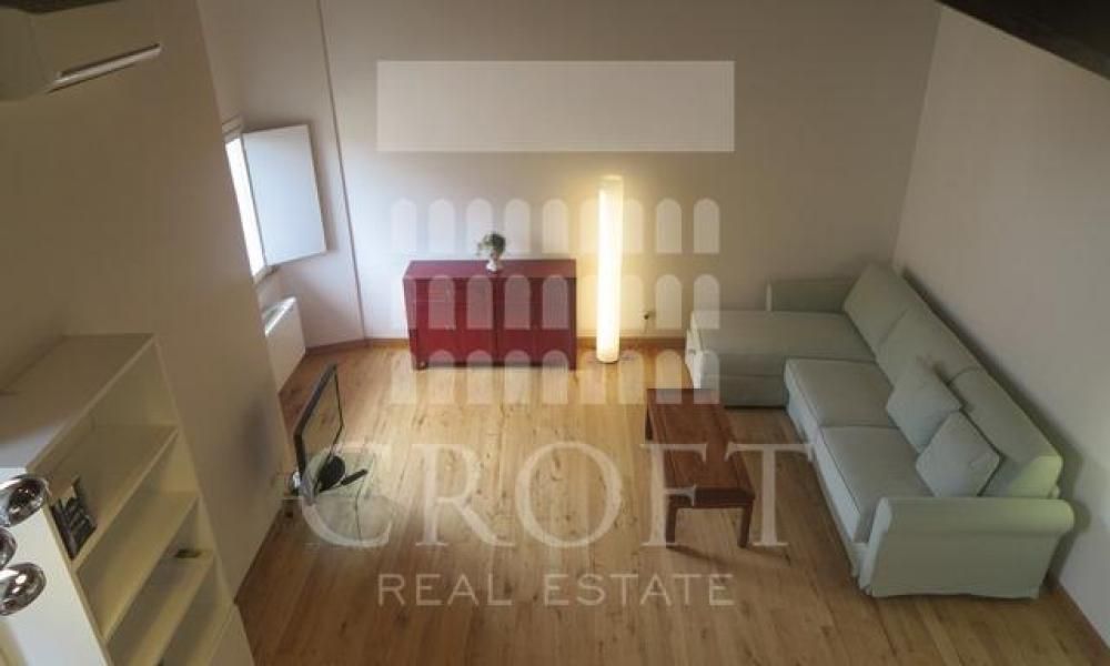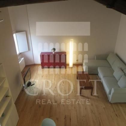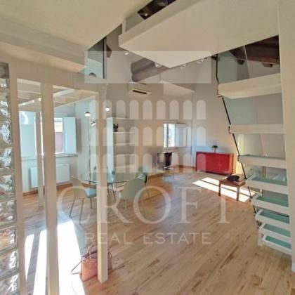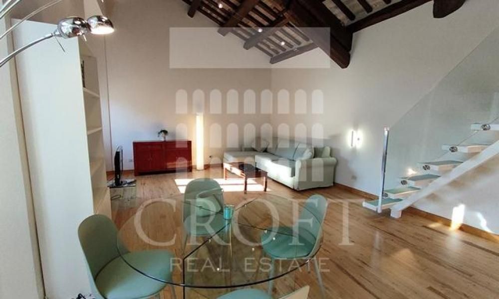 L’appartamento disposto su due livelli si compone al primo livello di un'ampia zona giorno con cucina a vista. Il soggiorno, arredato in stile moderno, è il vero cuore della casa, caratterizzato da un imponente soffitto alto 5 metri con le originali travi in legno a vista, che conferisce un'atmosfera calda e di grande carattere, i pavimenti in parquet aggiungono un tocco di eleganza naturale, mentre l'aria condizionata assicura un comfort ideale in ogni stagione. L'abbondante luce naturale inonda lo spazio grazie a tre ampie finestre, che offrono una vista indimenticabile sui suggestivi tetti di Roma e sui suoi monumenti. Il soggiorno è dotato di un pratico divano letto e la presenza di un bagno di servizio al piano lo rende perfetto per accogliere gli ospiti. Completa la zona giorno la moderna cucina a pianta aperta completamente attrezzata situata in un'alcova dello spazio abitativo. Dotata di lavatrice, lavastoviglie, piano cottura e grande frigorifero e tanto spazio per riporre gli oggetti.