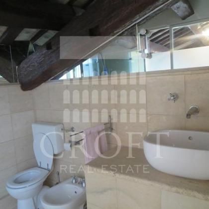 Un'elegante scala dal design contemporaneo conduce al livello superiore. Qui si trova una camera da letto a soppalco, un rifugio intimo e silenzioso. Lo spazio è stato sapientemente ottimizzato, offrendo anche un'accogliente zona studio e un armadio capiente. Il bagno padronale, spazioso e luminoso grazie alla sua finestra, è completo di una moderna doccia, WC e bidet, garantendo la massima comodità.