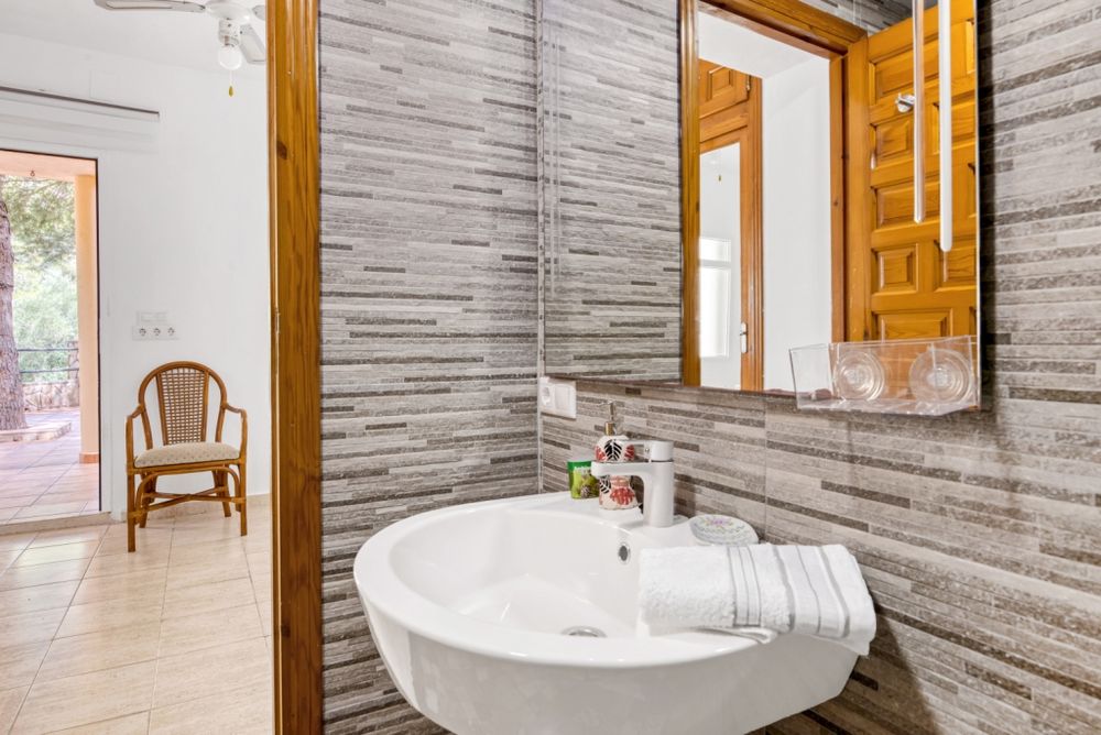 Main floor: 2 bedrooms with mountain views, bathroom with shower and washing machine, fully equipped kitchen, and independent dining room in the tower. Very bright living room with 3 large windows and direct access to the pool terrace and chill-out area. Spacious and cozy, with high ceilings over 3 meters tall, fireplace, TV, sofas, and views of the pool, mountain, and sea. On the ground floor, with independent entrance, there are 2 spacious bedrooms and 2 fully renovated bathrooms with showers, a living-dining room with an open kitchen, and exits to several terraces.