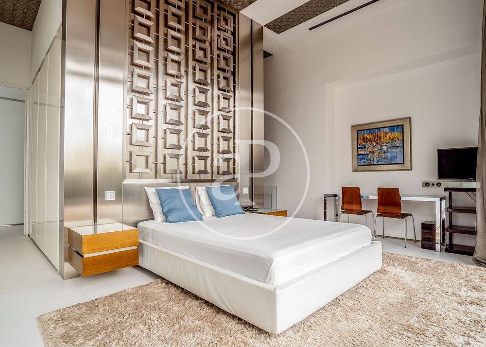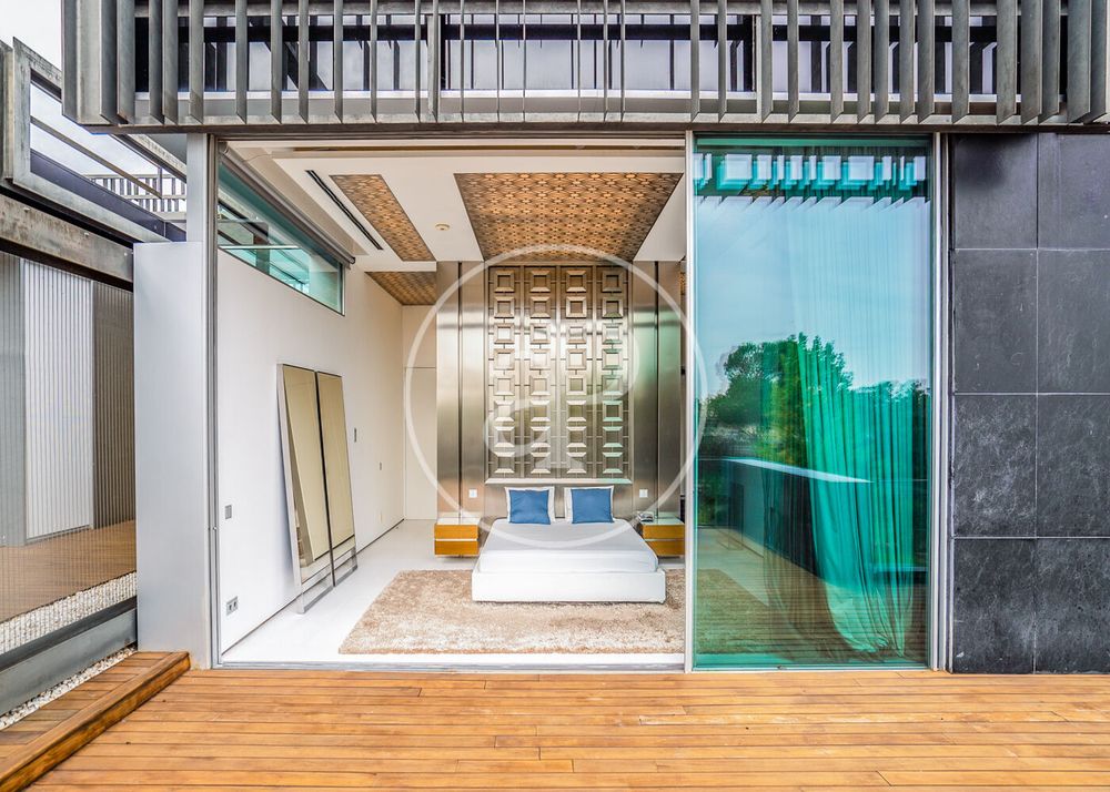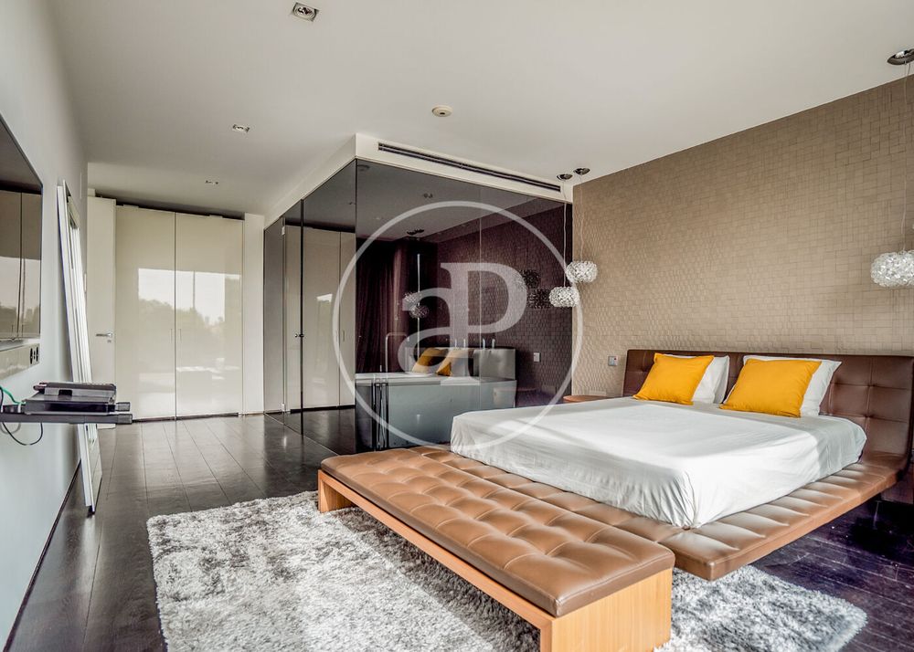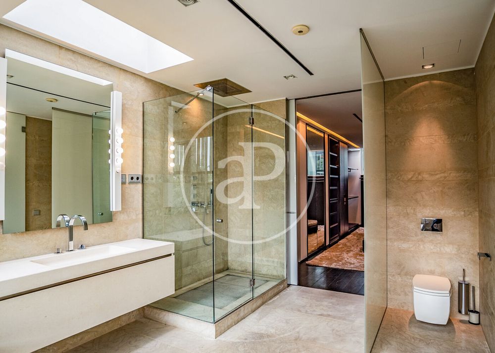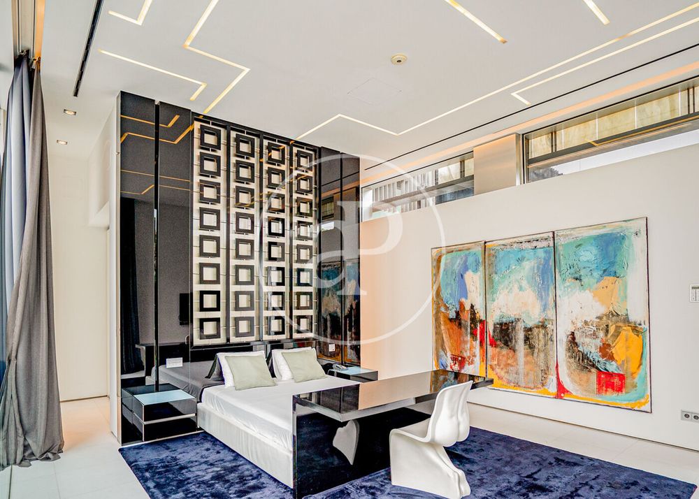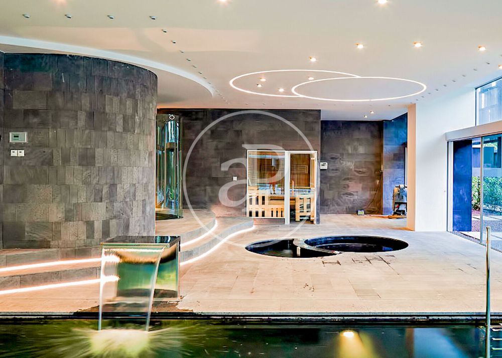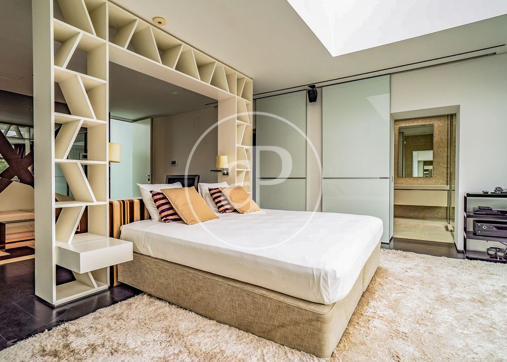 Within its more than 2.000m2 built can enjoy this beautiful house more than 15 people, as we are facing a house with 8 large bedrooms and 8 bathrooms. The impressive master bedroom, located on the highest floor of the house, has two full bathrooms and two large dressing rooms, plus a relaxation area and all facing south of Madrid. In the most fun areas of the house we find a room giving to play pool, a multipurpose table for cards, with a glass cellar at the foot of the billiards. In addition, we have an indoor Squash court, a Spa with all luxury of details and a semi-Olympic pool that comes out of the center of the house to the majestic garden. In the 10.000m2 of plot we find an outdoor paddle tennis court, one of the two garages with space for 6 cars, as well as the outside bar of the disco, located on the first floor of the house.