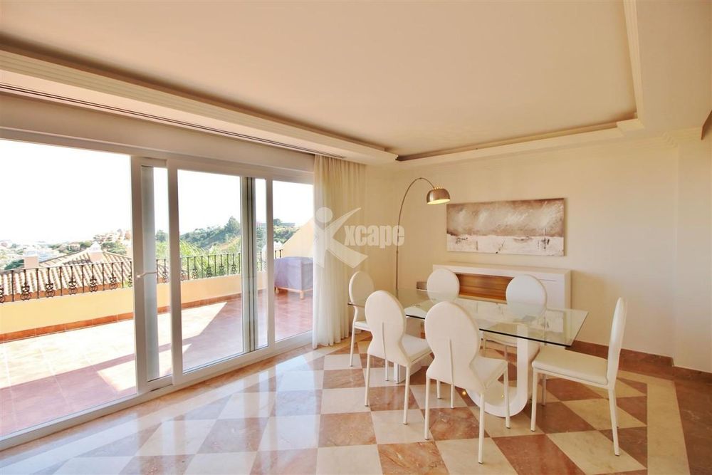 Luxury 2 bedrooms Penthouse Duplex for rent in Nueva Andalucia. Located in higher part of the famous golf valley and only a few minutes driving from Puerto Banus and Marbella. With excellent building qualities, the property has a bright living room with a chimney, a dining area and access to a spacious terrace where you'll be able to dine al fresco in the hot summer days. The apartment has a fully fitted kitchen with an utility room with washing machine and tumble dryer. The master bedroom has fitted wardrobes and ensuite complete bathroom with jacuzzi has access to a private terrace with amazing panoramic views. The apartment is fully furnished and has been decorated with style. The penthosue comes with one garage included in the price. The complex has security and cameras recording 24/7 and a beautiful pool in a quite location.