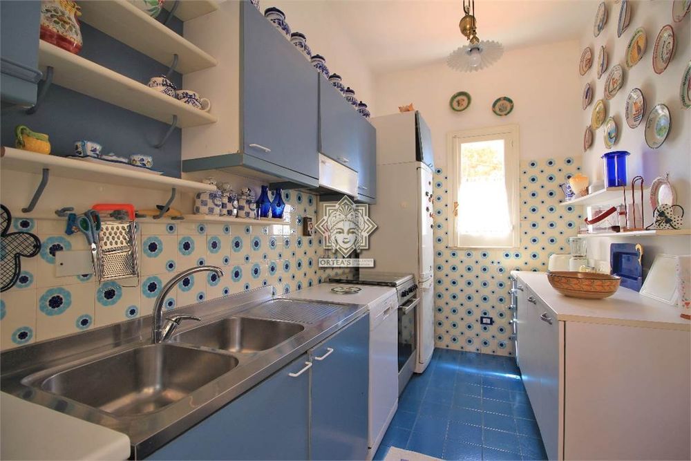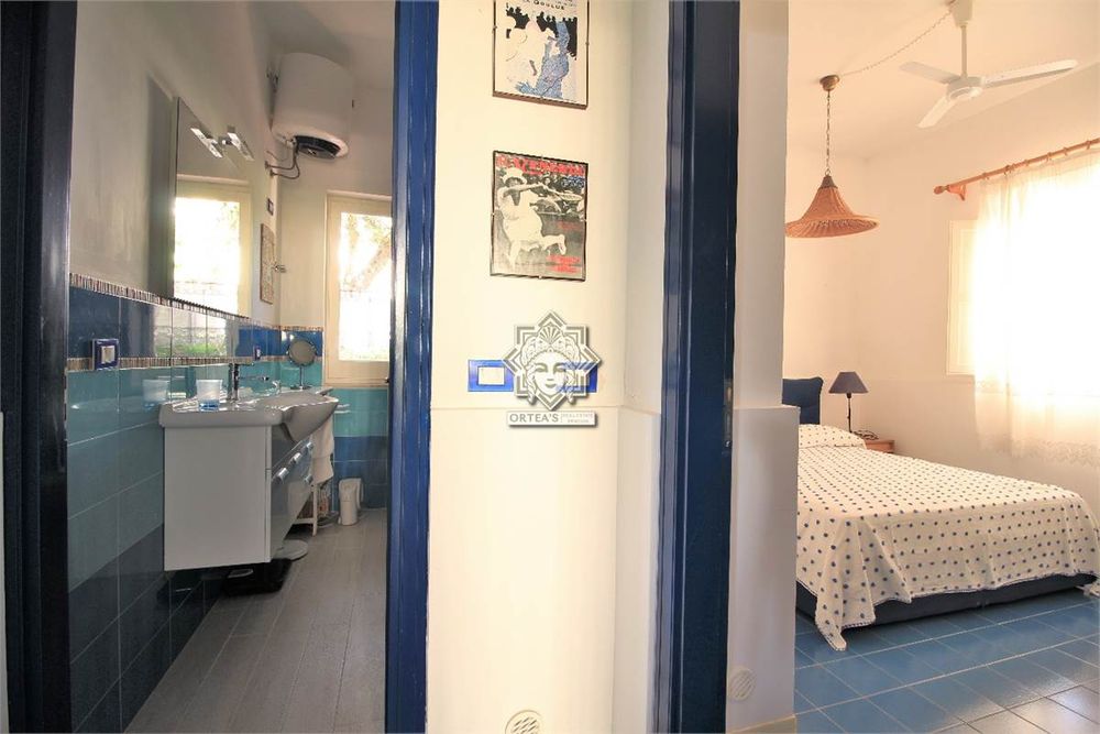 La villa di 115 mq oltre verande si caratterizza per i colori vivaci delle zone mediterranee dove spiccano il bianco e il blu cobalto di alcuni particolari come gli infissi esterni e le tende che riprendono gli stessi colori così come anche negli interni con pavimenti e porte di un blu accattivante. Questa villa con giardino dispone di tre camere da letto e due bagni con doccia, una living e cucina. oltre a due pratiche e funzionali verande coperte con possibilità di essere ben schermate da tende da sole.