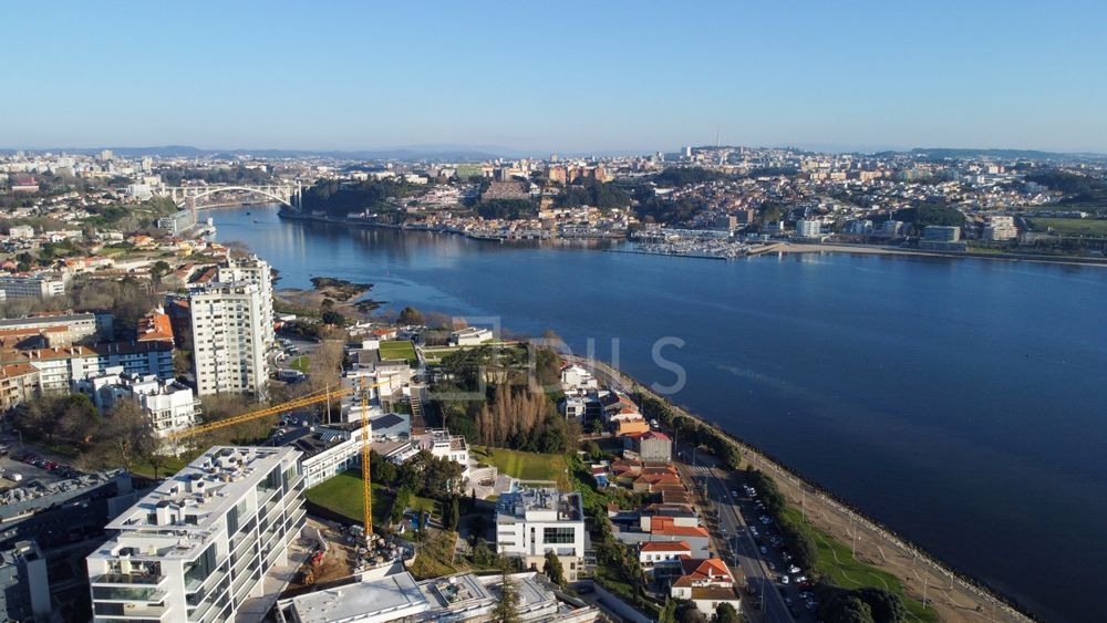 Apartamento com duas frentes, hall de entrada, uma sala com grandes áreas e vista para o rio Douro, cozinha equipada, despensa, 2 quartos com armários embutidos, um deles uma suíte, uma segunda de casa banho completa e 2 lugares de garagem e uns arrumos.
