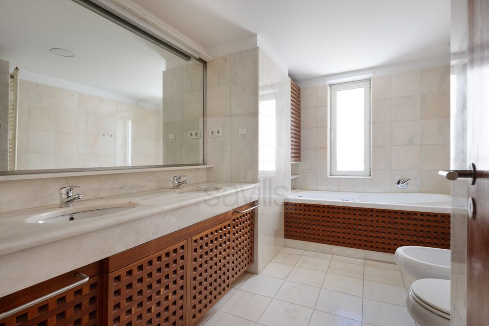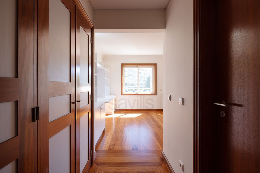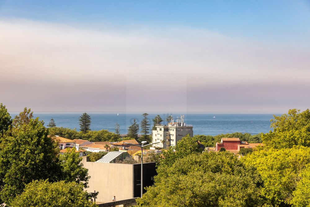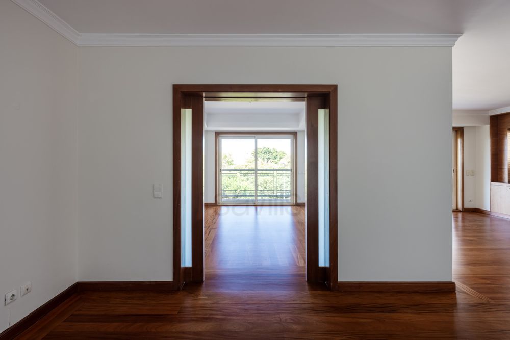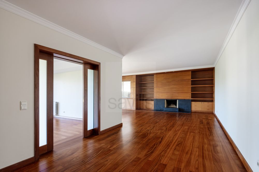 Apartamento com um grande hall de entrada, sala de estar com cerca de 70 m2 e sala de jantar com acesso direto a uma varanda virada a poente, com vistas rio e mar.