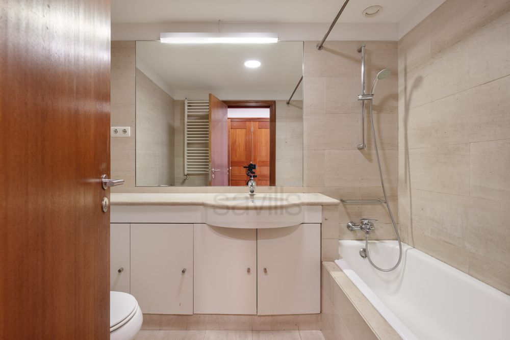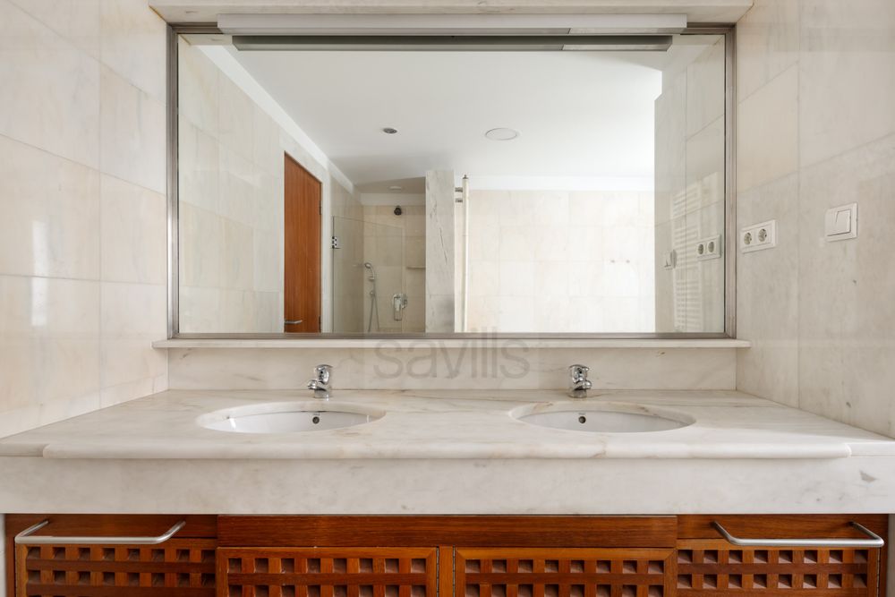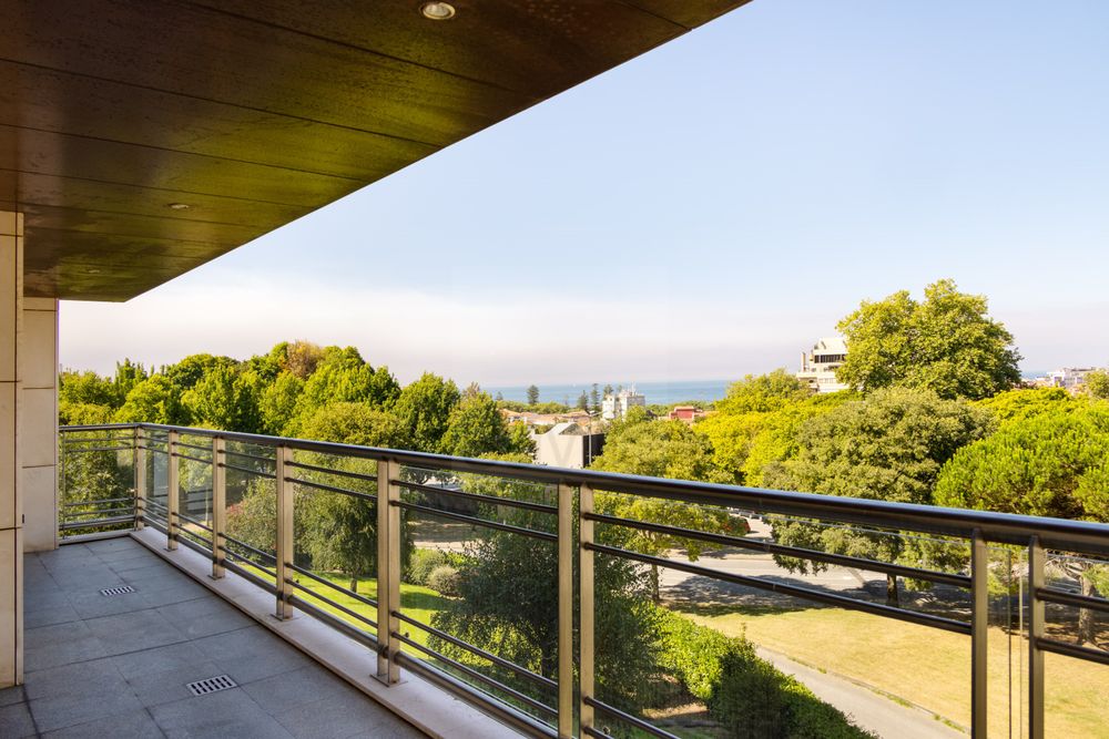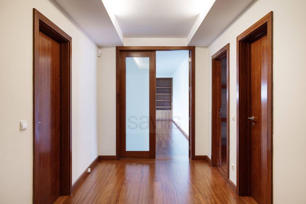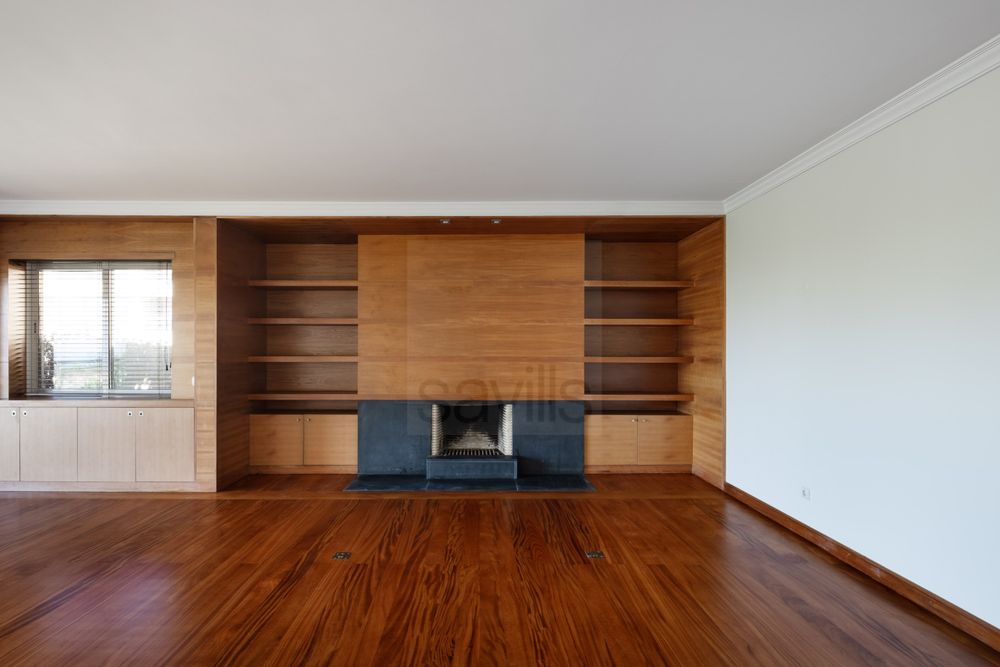 Apartamento com um grande hall de entrada, sala de estar com cerca de 70 m2 e sala de jantar com acesso direto a uma varanda virada a poente, com vistas rio e mar.