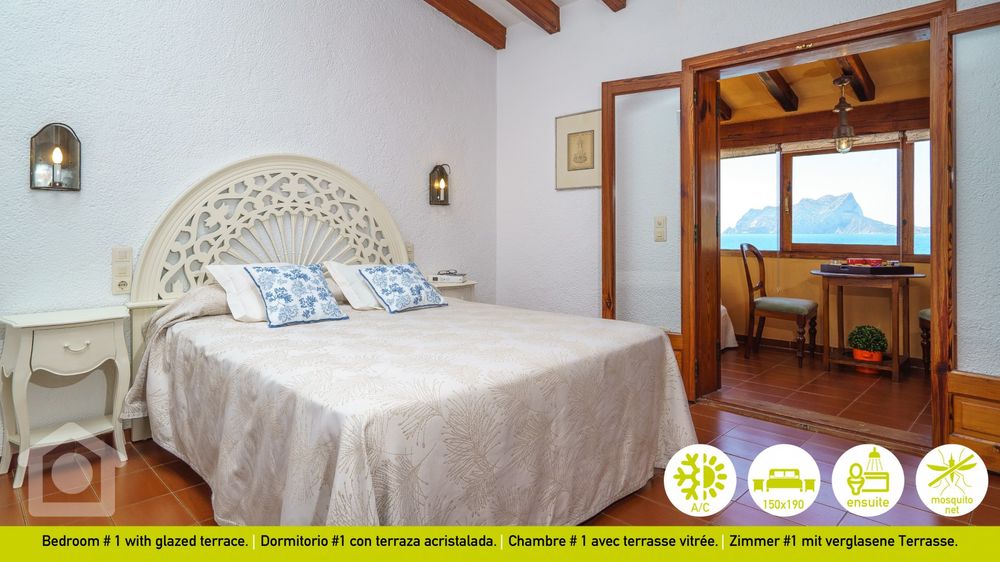 Its six bedrooms have air conditioning and beautiful sea views. On the upper floor is the main bedroom with an en-suite shower bathroom and a glazed terrace. On the same floor, there are two other double bedrooms sharing a bathtub bathroom, one with a double bed and another with two 90 cm beds. On the ground floor, there is another bedroom with a double bed and a glazed terrace with spectacular panoramic views. Next to it is a shower bathroom. The other two bedrooms are located next to the pool with independent access from the main house. These two bedrooms are ideal for a family with children as they are connected by a door and share a shower bathroom.