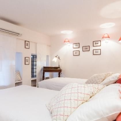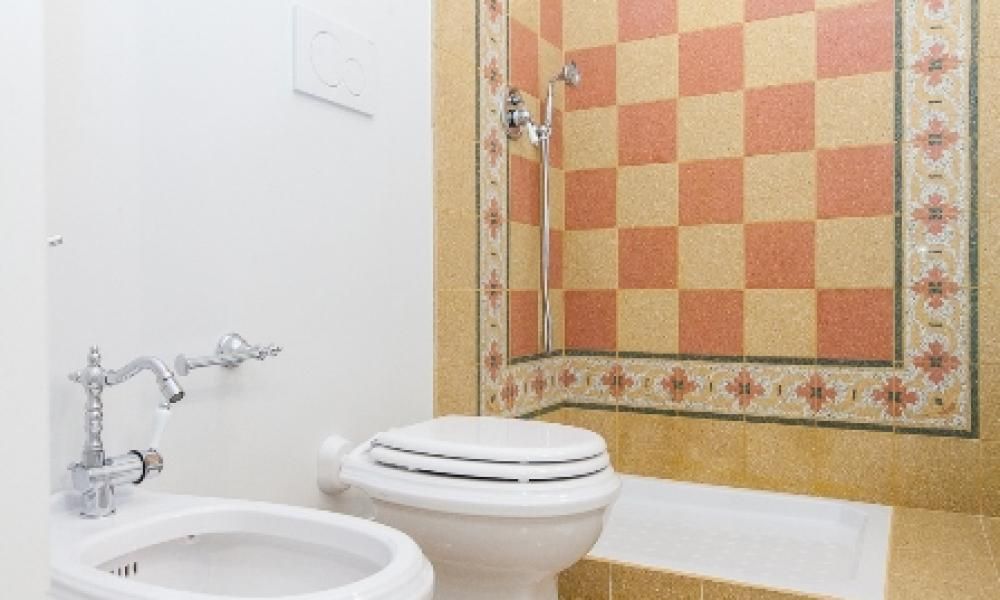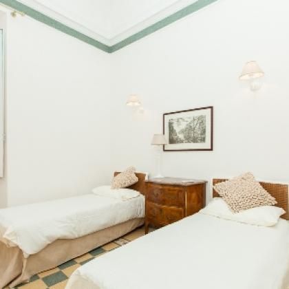The sleeping area is well-separated and accessible via an independent entrance. It includes four bedrooms and four bathrooms. The master suite is a spacious double bedroom with a view of the square and a private bathroom, completely renovated in marble and equipped with a shower and a tub. The second suite, also with a view of the square, has high ceilings and an en-suite bathroom with a shower and a tub. The third bedroom has two single beds and a private bathroom with a shower. An internal flight of stairs leads to the fourth bedroom with two beds and direct access to a small, quiet terrace overlooking the internal courtyard. A fourth full bathroom is located in the common area on the lower floor.