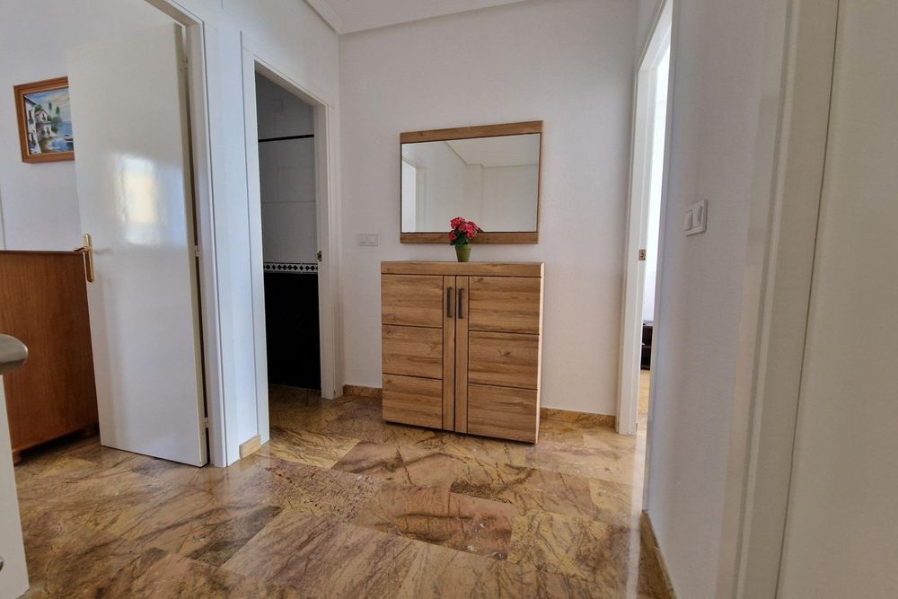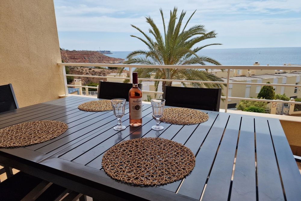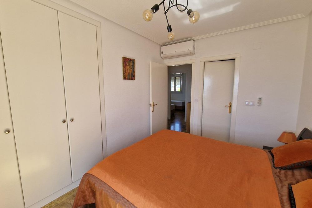 Chalet adosado de esquina con estupendas vistas al mar ! Residencial Calas de Campoamor en Calle Arturo Pérez Reverte. Vivienda de 110 v2 , con 3 dormitorios y 2 baños , cocina independiente con lavadero, salón con chimenea , terraza de 15 m2 con vistas al mar . La vivienda esta recientemente reformada , amueblada y equipada con todos los electrodomésticos. La vivienda tiene Wi-Fi , 3 maquinas de aire acondicionado/ calefacción, ropa de cama y toallas . Capacidad de alojamiento hasta 8 personas. Residencial despone de piscina comunitaria , hay plaza de aparcamiento en el garaje subterráneo. Distancia de la playa 150 metros . Supermercado y la zona con los bares y restaurantes esta en 200-300 metros de la vivienda.~~